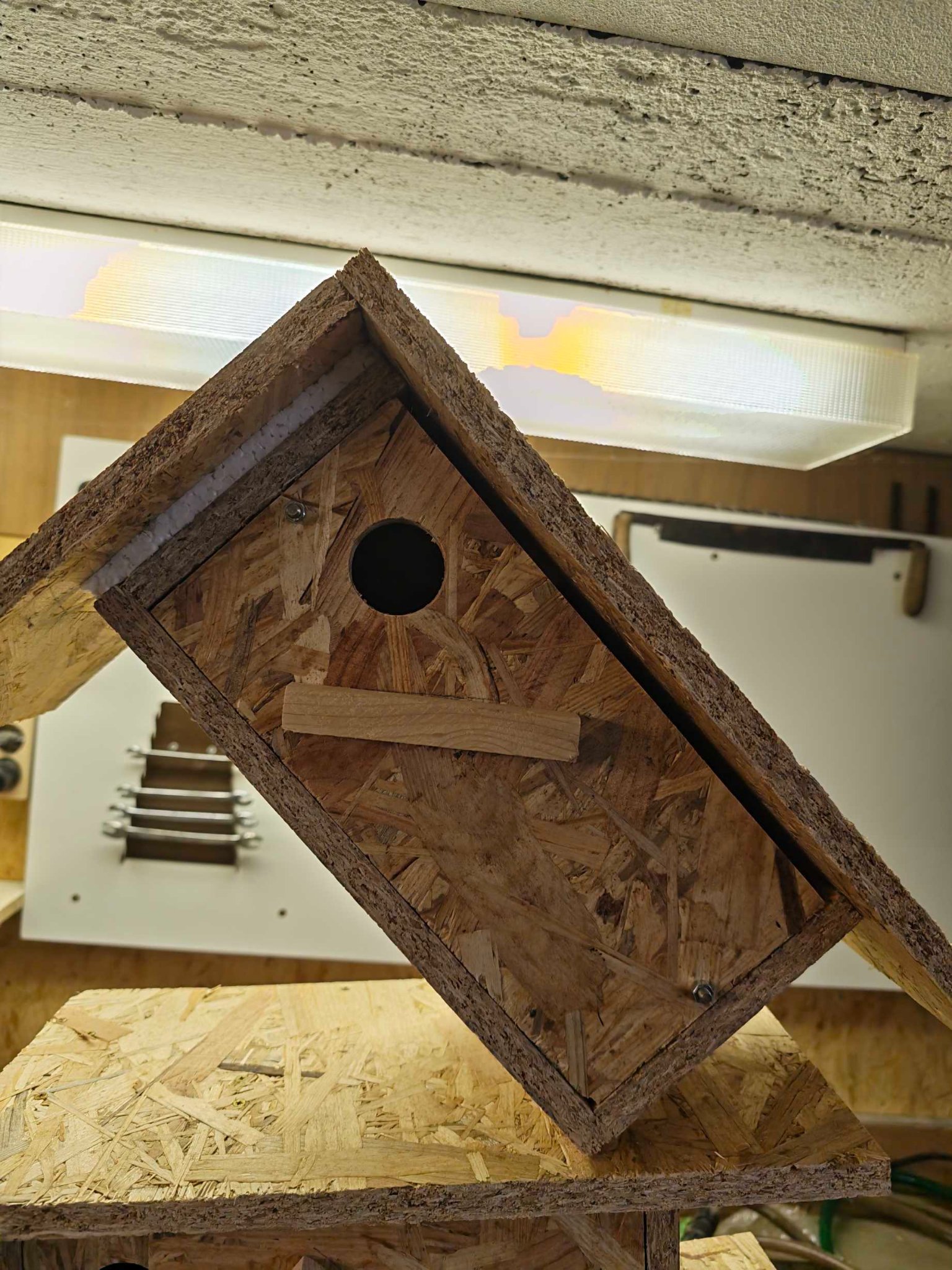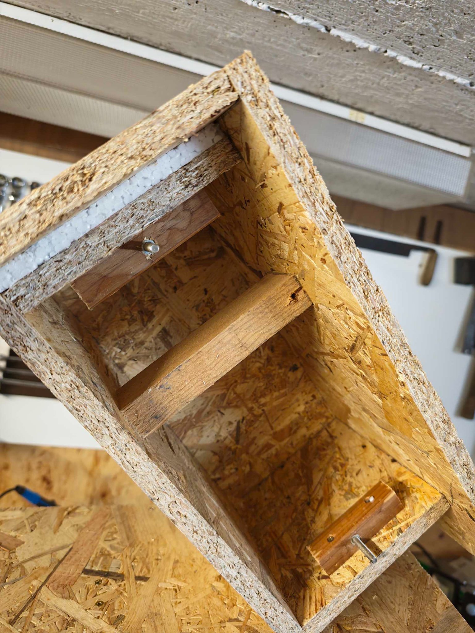 Anstrich des Kastens ist mit Leinölfirnis vorgesehen. Ob das Material (OSB-Platte dem Wetter gewachsen ist, wird sich zeigen müssen.