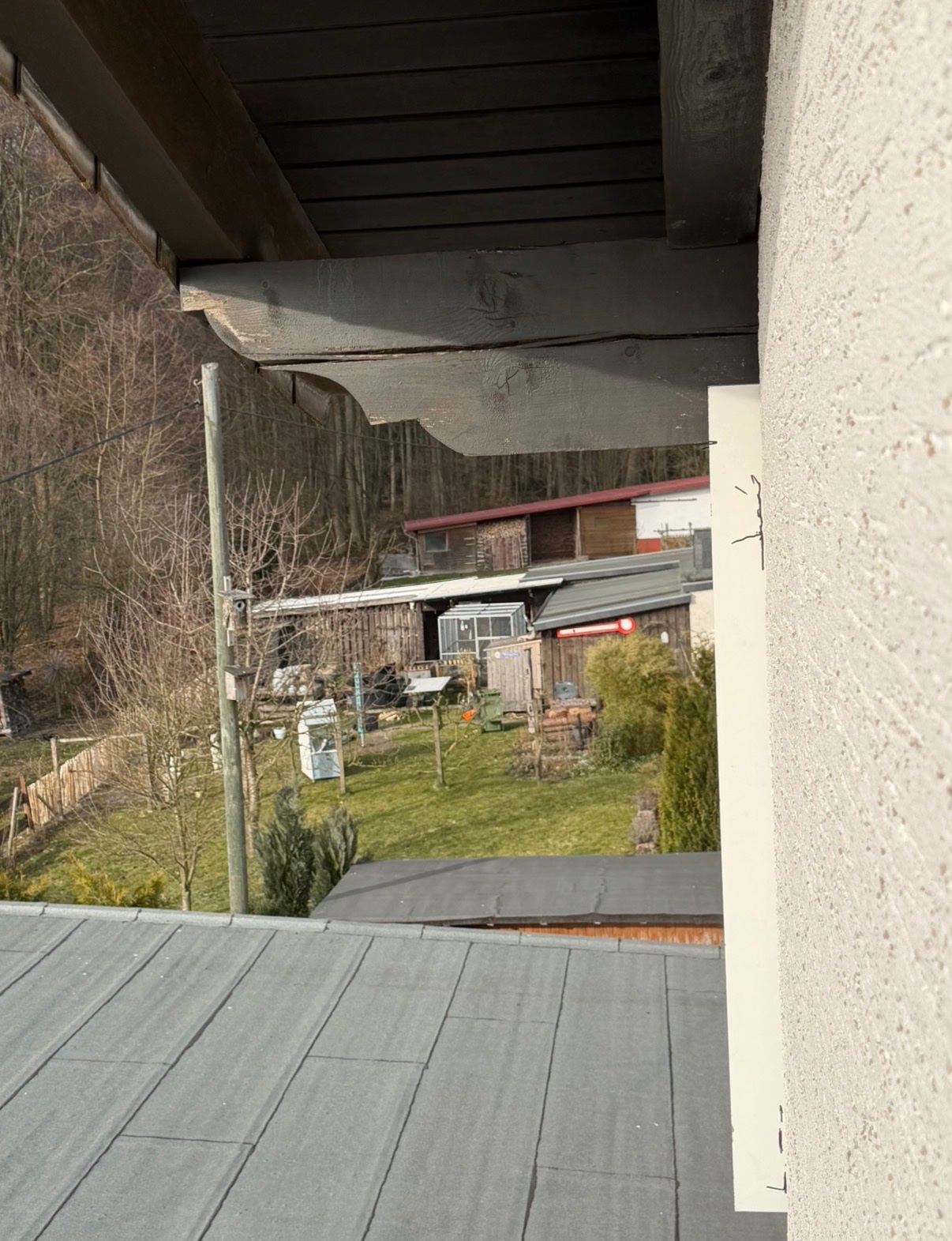 Da meine Plätze von Außen mit einer Kompaktplatte , gegen heraufkletternde Siebenschläfer geschützt werden sollte , passt mein Beitrag nicht ganz zu Deinem Thema, da ich zum Befestigen der Platte auf die Leiter musste.Zum Anpassen der Verkleidung , hatte ich diese immer vom Dachboden aus mit einem Seil hochgezogen und in die L.förmige Ausfräsung eingehängt, den Überstand der Platte an der Hausecke mittels eines an einer Latte befestigten Stiftes durch das offene Fenster im Giebel angezeichnet, so daß ich dafür nicht auf die Leiter musste, was mir sehr entgegenkam .
