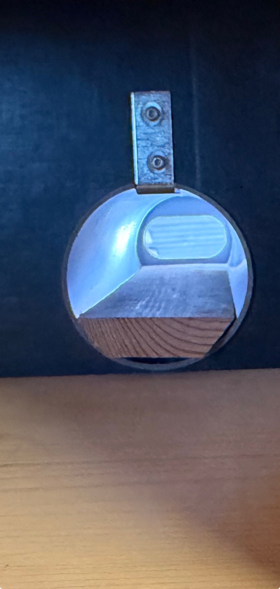 Lichteinfall durch den 5-mm-Spalt unter dem Dach. Der Einflug bewusst groß gewählt (40 mm) aber zu klein für Stare, Innenraum 13,5 x 13,5 x 28 cm. Um dem Ganzen mehr Tiefe zu geben, soll der Kasten später ungefähr so positioniert werden: