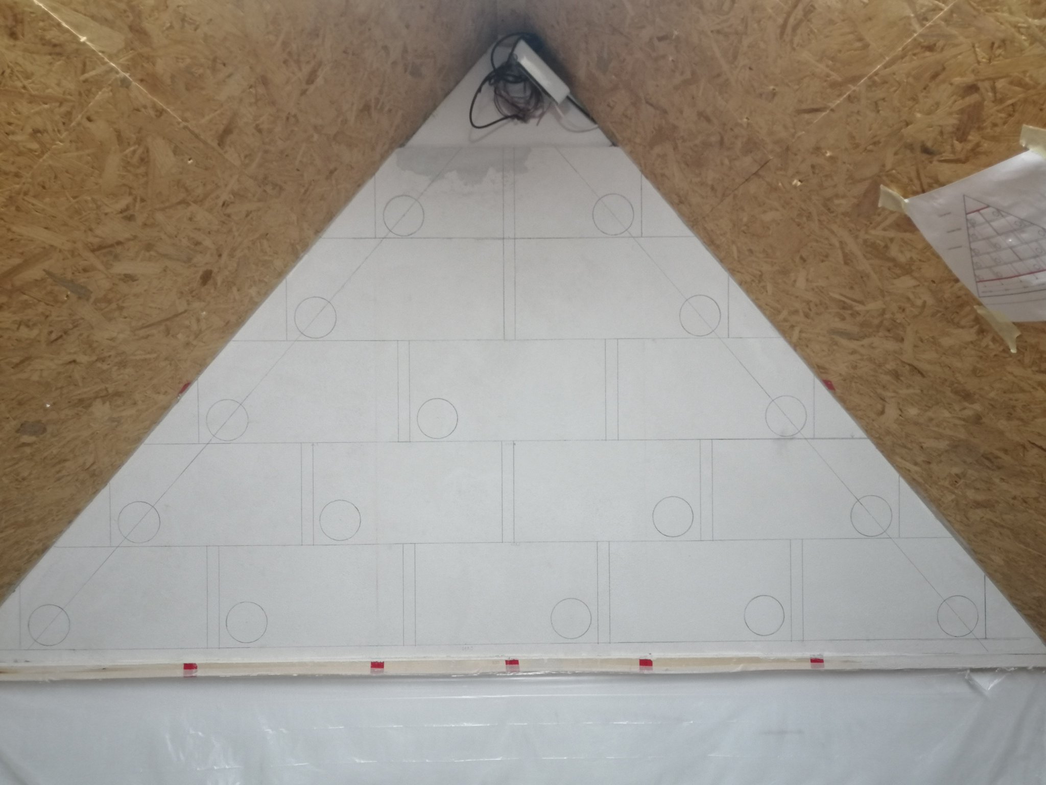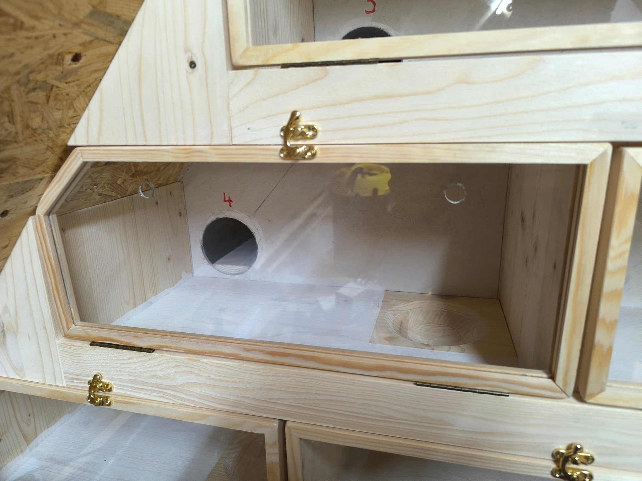 Als Material habe ich mich für eine Fichte 3 Schichtplatte in 27mm entschieden. Die Materialstärke nur deshalb, weil ich unbedingt die Nistmulde direkt ins Bodenbrett einbringen wollte und mir somit das zweite Einlegebrett oder die separate Nistmulde ersparen konnte. Da Plattenmaterial und auch die gesägten Brettchen sehr glatt sind, hat alles eine Grundierung bekommen für ordentlichen Grip (Quarzgrundierung). Als Frontabdeckung wollte ich unbedingt Glasfenster anfertigen. Fertige Nutleisten 4mm Nut gibt es zu kaufen. Das Glas schneiden ging noch relativ leicht, die Leisten auf Gehrung schneiden eigentlich auch, an der Dachschräge musste alles Trapezförmig angefertigt werden( oh, oh Mathe Winkel und Gegenwinkel Berechnung wenn das Dach 42° statt 45° hat) . Schwierig erwies sich jedoch das bohren von zusätzlichen Lüftungslöchern in den Glasscheiben, trotz reichlich Wasserkühlung ging hier einiges zu Bruch und mein Reservematerial an Glas war schnell aufgebraucht. Ein 20€ Glasbohrer aus dem Baumarkt reicht hier wohl nicht. Schließlich habe ich die Fenster etwas luftiger gestaltet und mich zusätzlich gefragt ob die Löcher überhaupt etwas bringen, wenn der Dachboden komplett gedämmt ist, selbst kein zusätzliches Fenster hat und die Dachluke verschlossen ist? Die Temperatur im Kasten wird natürlich überwacht….aber der Sauerstoffgehalt?