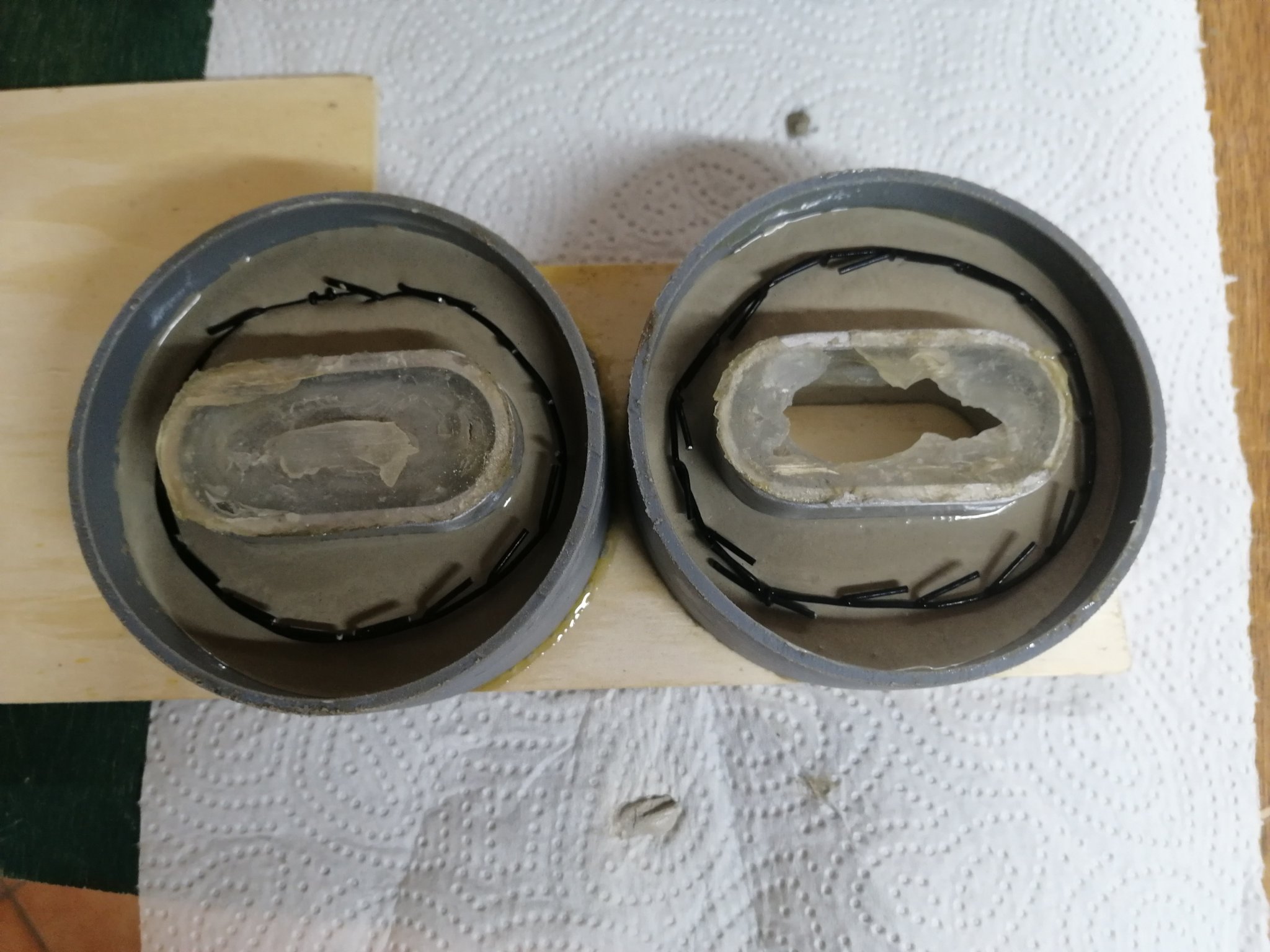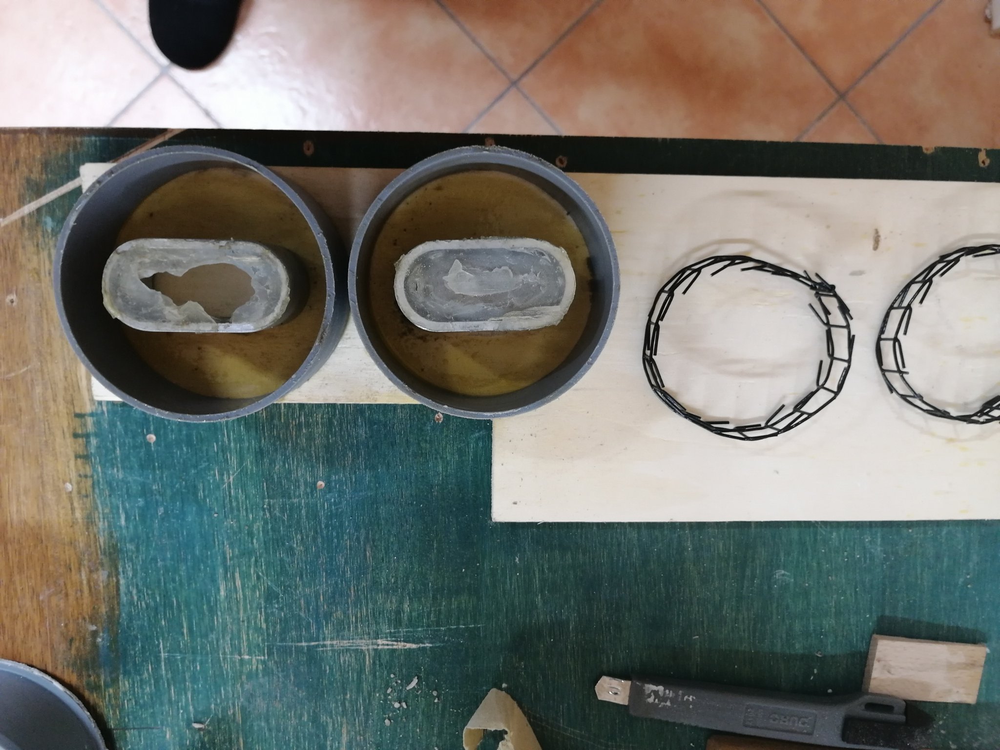 Aus einem Reststück HT Rohr 90mm ca. 30mm gerade abgeschnitten, dieses nur punktuell mit Sekundenkleber auf ein Reststück Sperrholplatte geklebt. Das Mittelstück besteht aus Alu Oval Rohr mit dem vermeintlichen Idealmaß von außen 60 x 30mm, ebenfalls auf ca. 30mm abgeschnitten u punktuell mittig eingeklebt. Dann habe ich aus Reststücken von Volieren Draht ein Bewehrungskorb geformt u diesen mittig mit eingebracht, also auch mittig im Beton. Ich habe Bastelbeton verwendet, man kann aber sicherlich auch selber mischen. Beim Aushärten des Beton (Bestelbeton eigentlich nur wenige Stunden) hat sich gezeigt, dass 2 Tage warten besser ist(Test Gewicht Küchenwaage). Da der Bastelbeton mangels Kiesanteil sehr glatt ist, habe ich im unteren Bereich eine Nut eingefräst. Die fertige Einflugrosette wurde nun zur Hälfte ins HT Rohr geklebt, der herausstehende Teil mit Acryl im Bohrloch verklebt und anschließend verputzt. Bei den Laufbrettchen war es für mich wichtig, dass diese zwingend Formschluss zum HT Rohr haben, also nicht nur nach unten sondern auch seitlich. Also musste ein Rundholz mit demselben Innendurchmesser her. Aus einer 90mm Palisade (real nur 87mm) habe ich dann diese Brettchen gesägt. Unter den Brettchen befinden sich Löcher im HT Rohr, über die ich das HT Rohr zuvor selbst im Bohrloch mittels Bauschaum (Pistole und Schlauchverlängerung) befestigt habe. Die Löcher im HT Rohr natürlich da wo die Steine darunter hohl waren.