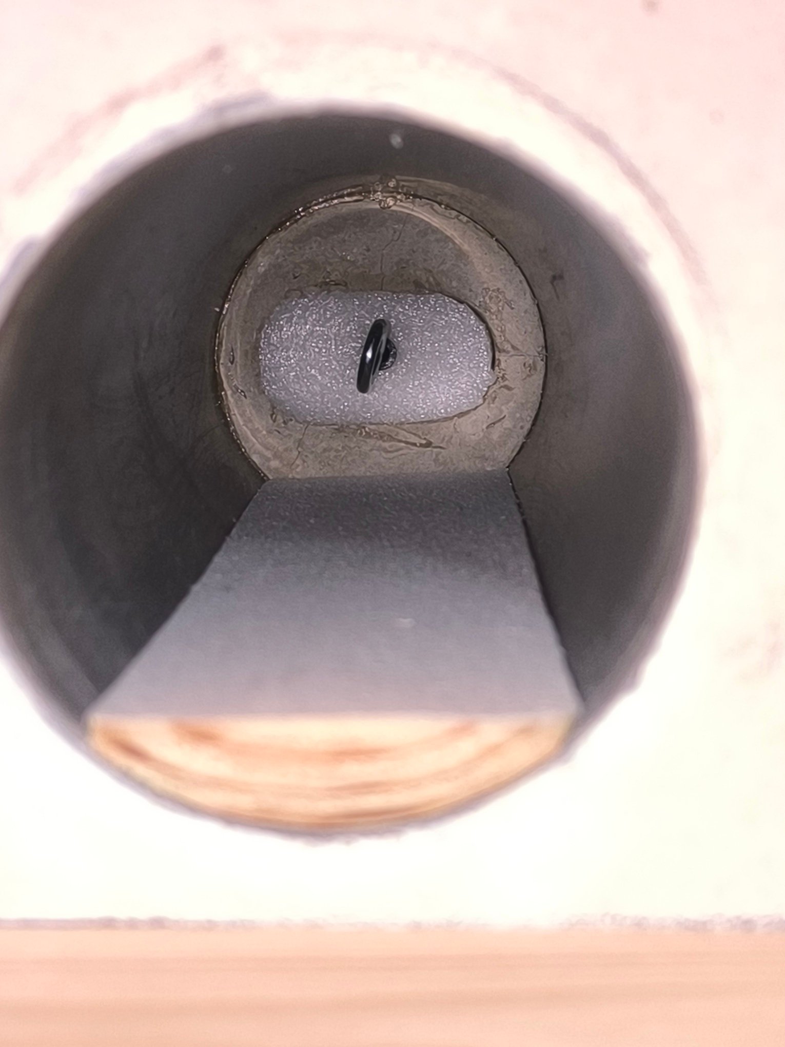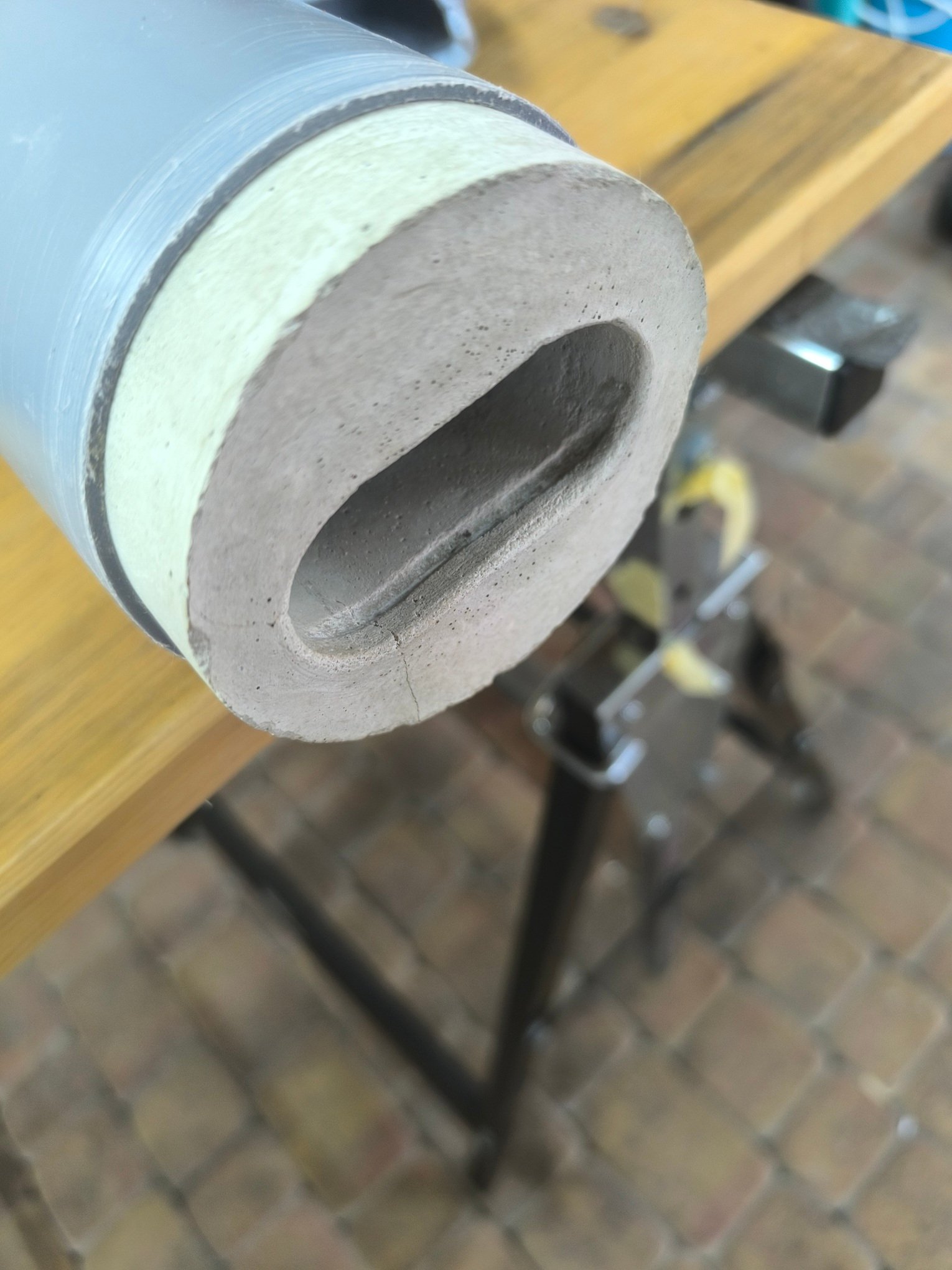 Angefangen bei den Bohrlöchern habe ich mich letztendlich nicht nur aus zeitlichen sondern durchaus auch aus wirtschaftlichen Gründen entschieden diese anfertigen zu lassen. Das Angebot war so günstig, dass mangels örtlicher Ausleihmöglichkeit die Anschaffung von Kernbohrmaschine, Bohrkrone und Absauganlage nicht wirtschaftlich gewesen wäre. Schon allein der Profistaubsauger hat beim Bohren einen so großen Unterdruck erzeugt, dass beim Bohren von Innen nach Außen kein Putz draußen herunter viel. Dank Armierungsgewebe im Außenputz gab es auch keine Ausplatzungen. Die Bohrlöcher selbst betragen 92mm. In diese habe ich dann das 90mm HT Rohr eingefügt mit zuvor eingeklebter Einflugrosette. Für das Anfertigen der Einflugrosetten hat es doch zahlreiche Versuche gebraucht, bis es endlich funktionierte. Zunächst wollte ich eine feste Form bauen die ich immer wieder verwenden kann. Es zeigte sich jedoch, dass das herauslösen des ausgehärteten Beton aus der Form schwieriger als gedacht ist, da half auch kein zuvor eingebrachtes Schalöl. Des Weiteren zeigte sich das bei der Einflugrosette für ein 90mm HT Rohr, Innendurchmesser 86mm die Seitenwände so schwach sind, dass sie beim Herauslösen zerbrechen. Im Ergebnis habe ich es wie folgt gemacht.