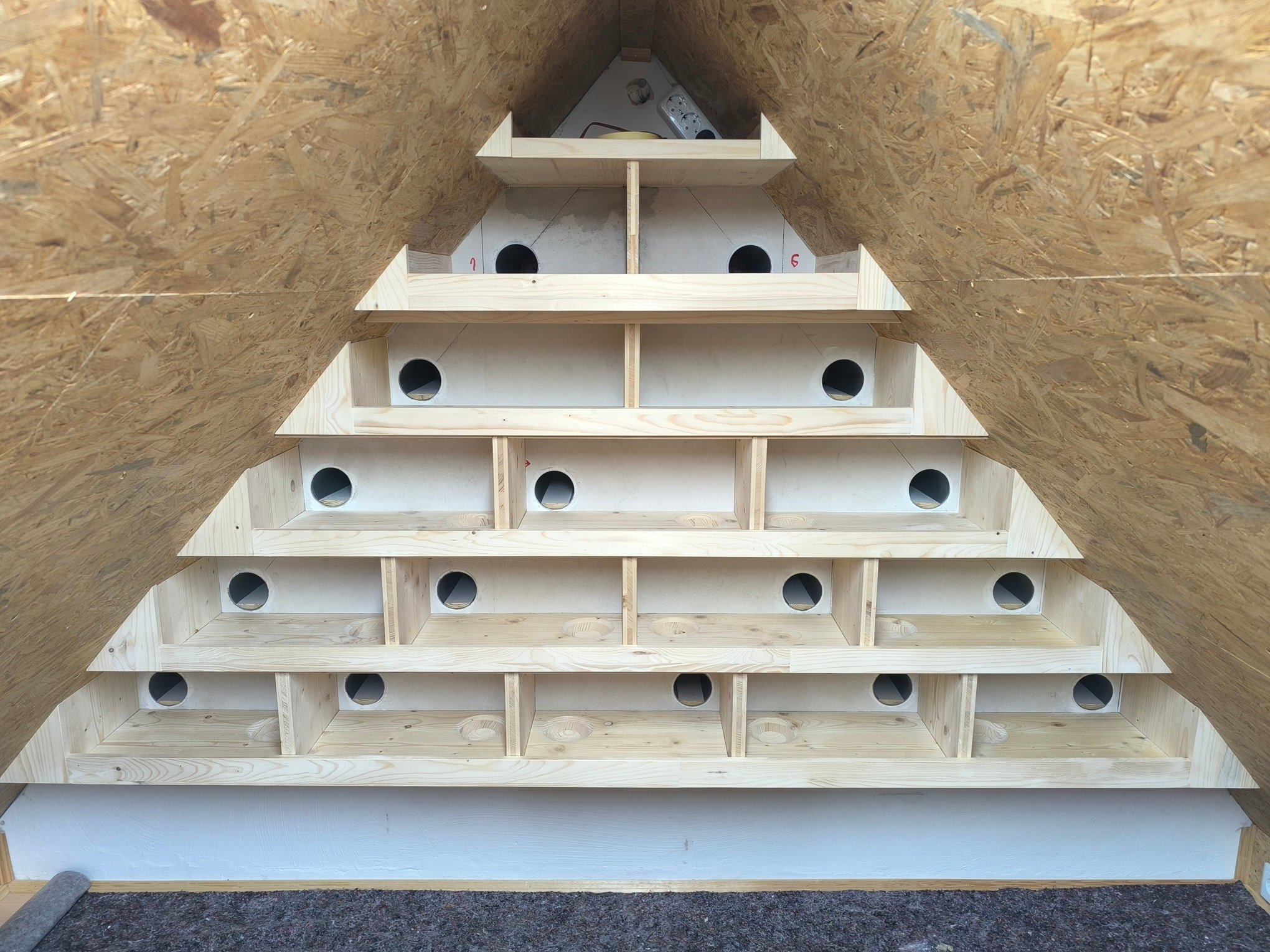 Insgesamt sind es 16 Nistplätze geworden, dass ganze auf 5 Etagen als Pyramide in Regalbauweise. Die Größe sollte komfortabel genug sein und beträgt je nach Aufteilung in den einzelnen Reihen ca. 42 bis 50cm x 25cm x 21cm BTH. In der obersten Reihe war diese Aufteilung nicht mehr möglich, daher der Versatz nach vorne ca. 36cm x 37cm x 21cm BTH.