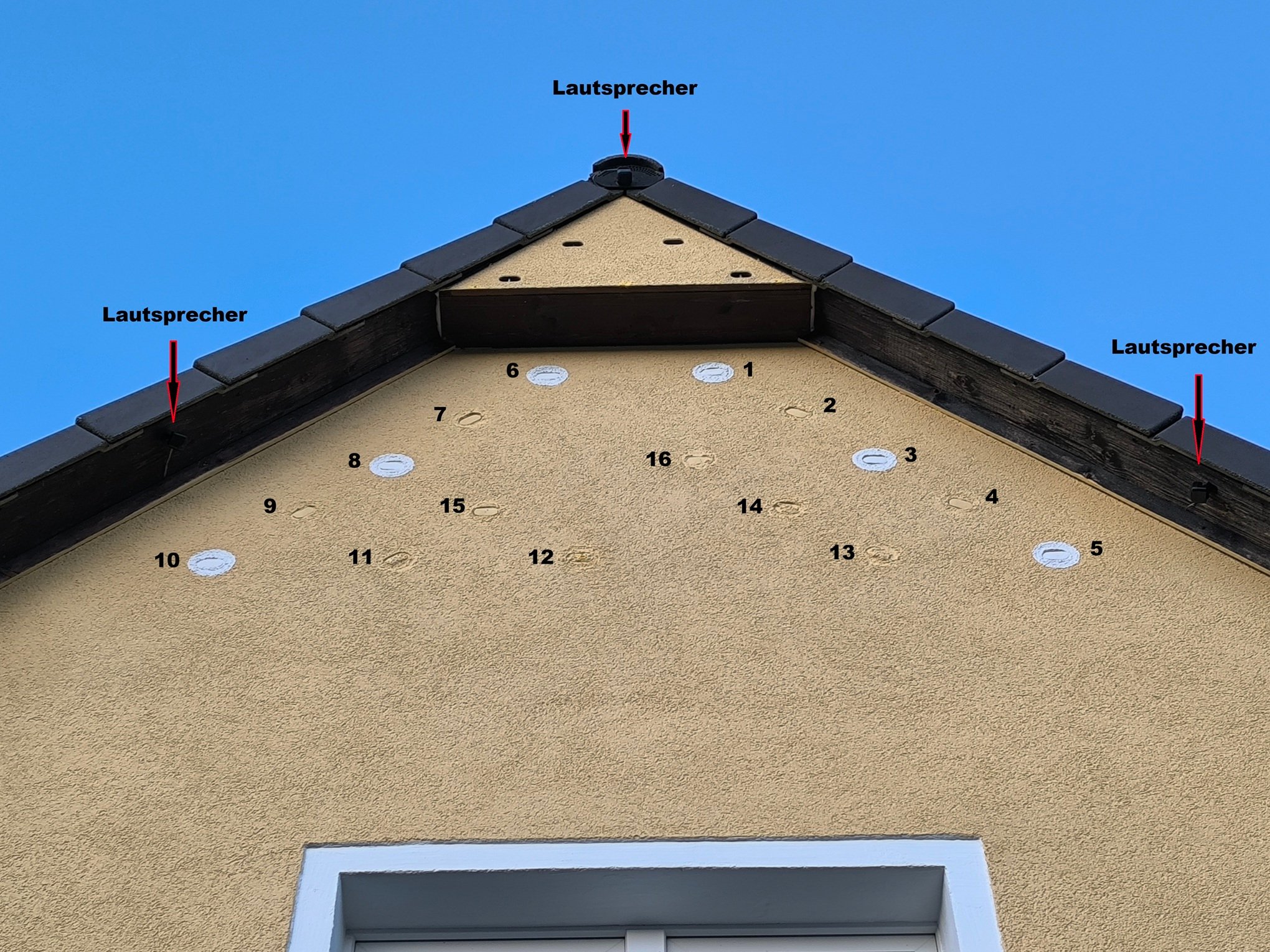 Ja und nun zu den zuerst zu öffnenden Einfluglöchern. Ich würde insgesamt 11 Einfluglöcher frei geben(siehe Foto Nr.1 bis Nr.10). Das 11. Loch in der Mitte der Wand(Nr.12) eigentlich nur zum Testen und weil es am weitesten von den anderen entfernt ist. Ich habe die weiß umrandeten Einflugrosetten waagerecht angebracht (Nr. 1, 3, 5, 6, 8 und 10), die dazwischen in Fassadenfarbe um 45° gedreht (Nr 2, 4, 7 und 9). Die Öffnungen selber haben einen Abstand von ca. 30cm. Das anbringen zusätzlichen Unterscheidungen in Farbe oder Holzbrettchen habe ich erstmal noch nicht vorgenommen.