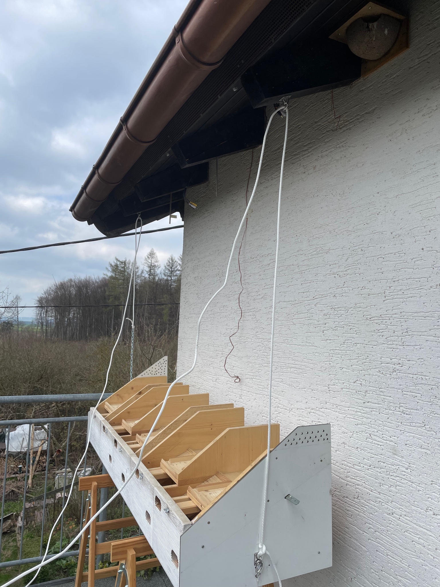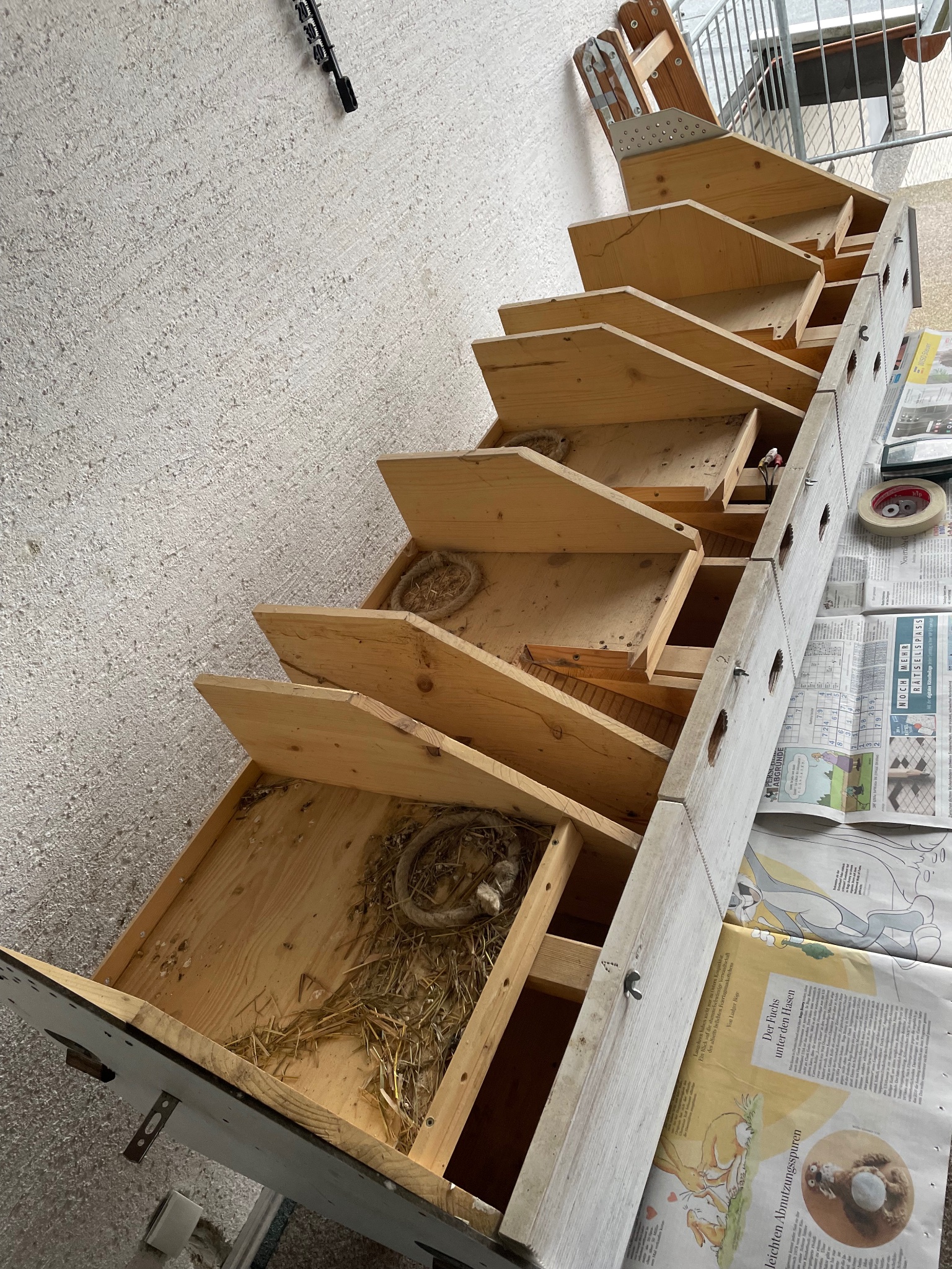 heute hatte ich mit meinem Sohn ( den Kasten will ich noch mal wiegen ), den Mauerseglerkasten ( zehn Brutplätze ) abgenommen ,um die zwei bebrüteten Nistkammer zu säubern,eine weitere Kamera einzubauen und eine Vorrichtung anzubringen , damit man den Kasten hochziehen kann , denn er hat ganz schön Gewicht, muß auf zwei Gewindestangen geführt werden und gleichzeitig müssen Kabel an ihren Platz . Ich hoffe die Konstruktion funktioniert.Parasiten, Lausfliegenpuppen waren nicht zu finden.