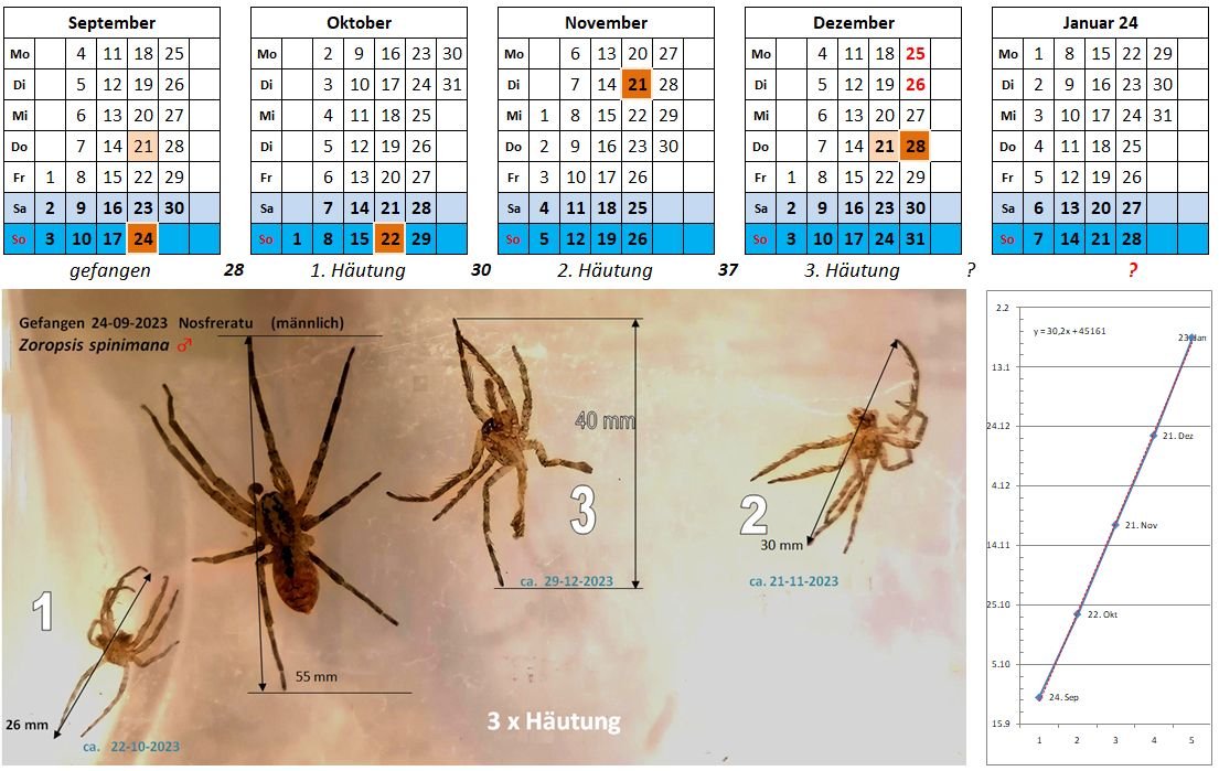 Waechter hat geschrieben: Mo 22. Jan 2024, 10:45 Die bisherigen Häutungen beim Männchen waren im Abstand von etwa 31 Tagen und habe mit den Daten etwas spekuliert.