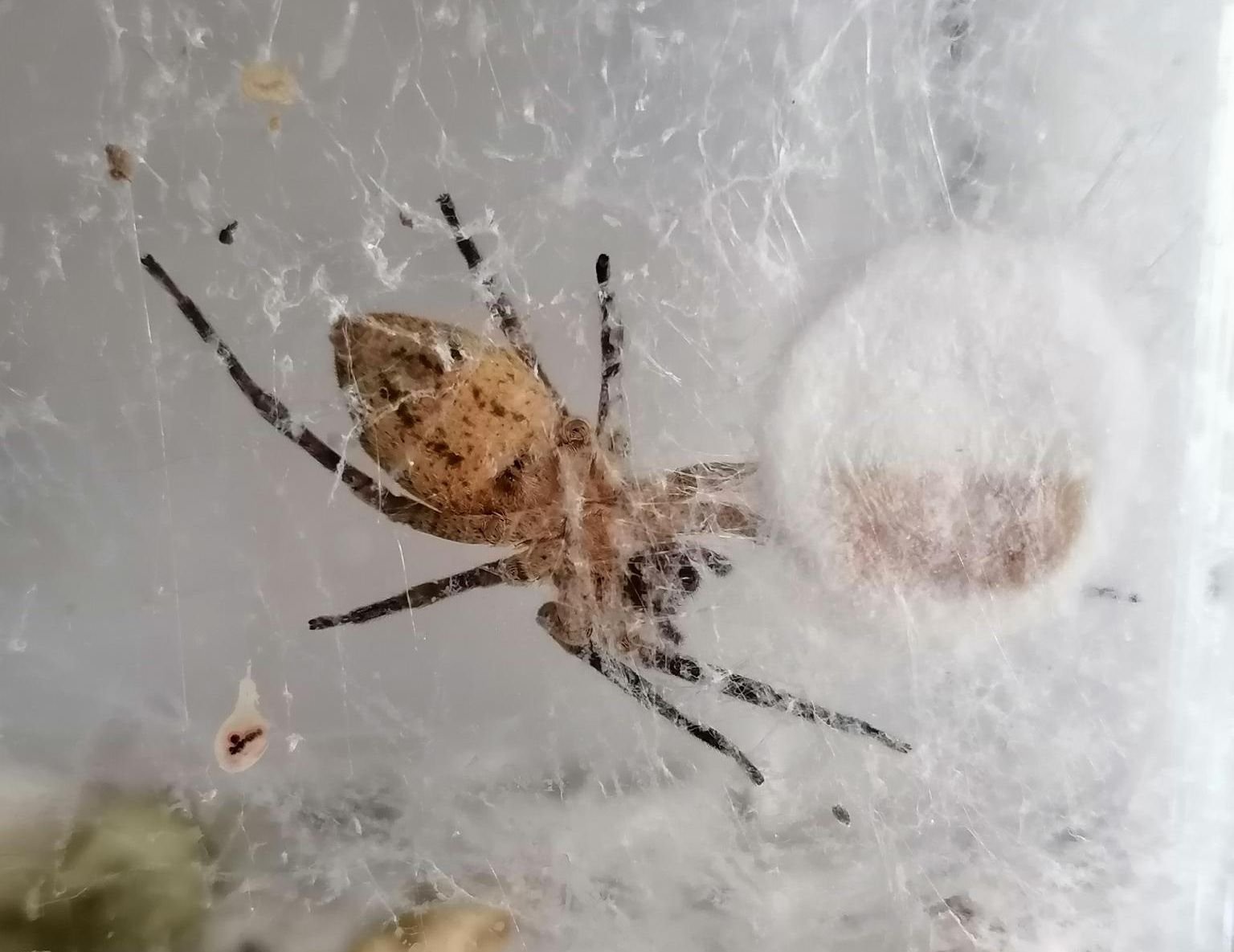 13-12-2022 hatte das erste Weibchen nur einen Kokon gebaut. 2023 hat das zweite Weibchen zwei Kokons gefüllt. Diese Eier sehen zwar dunkel aus, aber mit der Temperatur <20°C ist es für sie eventuell zu kalt.