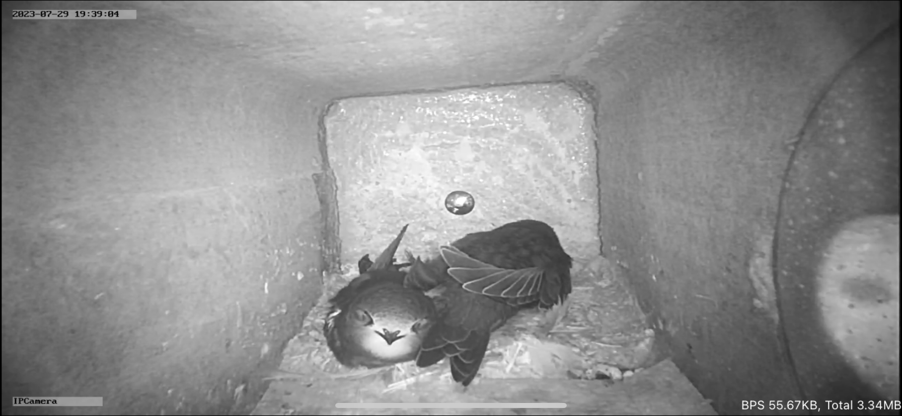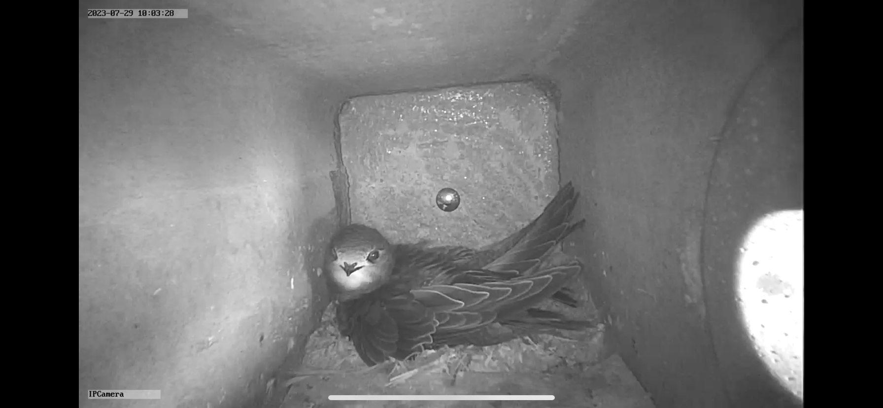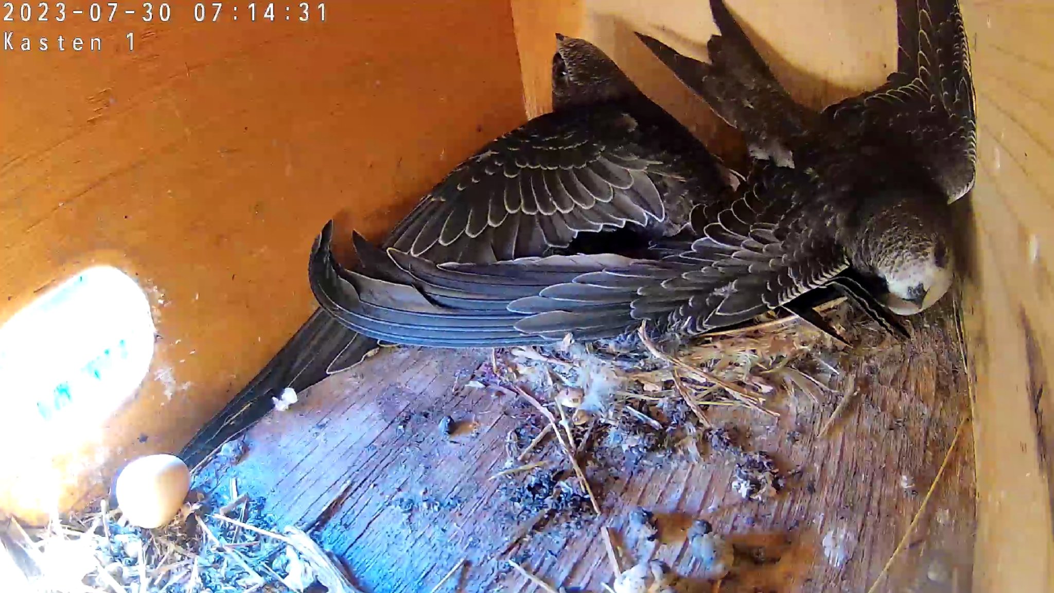 seit 3 Tagen hab ich abends nicht mehr beobachtet, dachte mein Verlobungspaar sei wahrscheinlich schon abgereist. Als ich heute aber 15 Segler hab kreisen sehen, dachte ich mir ich schau vielleicht doch nochmal genauer hin. Und siehe da, gerade eben um 20:55 Einflug in den Kasten und laute Begrüßung. Scheint, als ob sich das Verlobungspaar trotz schlechtem Wetter ziemlich wohl fühlt!