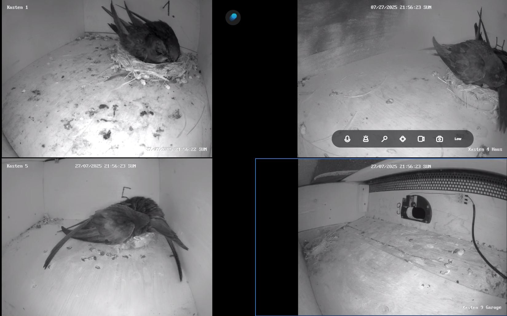 In einem Nest mit Einzelküken übernachtete heute nur ein AV. In den anderen drei mit insgesamt sieben weiteren kleineren JV beide Eltern. Ich hoffe, dass das auch im Starenkasten auf der Ostseite mit zwei Küken, aber ohne Kamera, so ist.