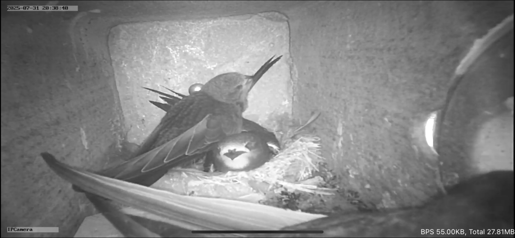 mein letztes (neues)Brutpaar hat verspätet angefangen,so habe ich noch 2 Jungvögel in den einsehbaren Kammern im Giebel,die ich beobachten kann.