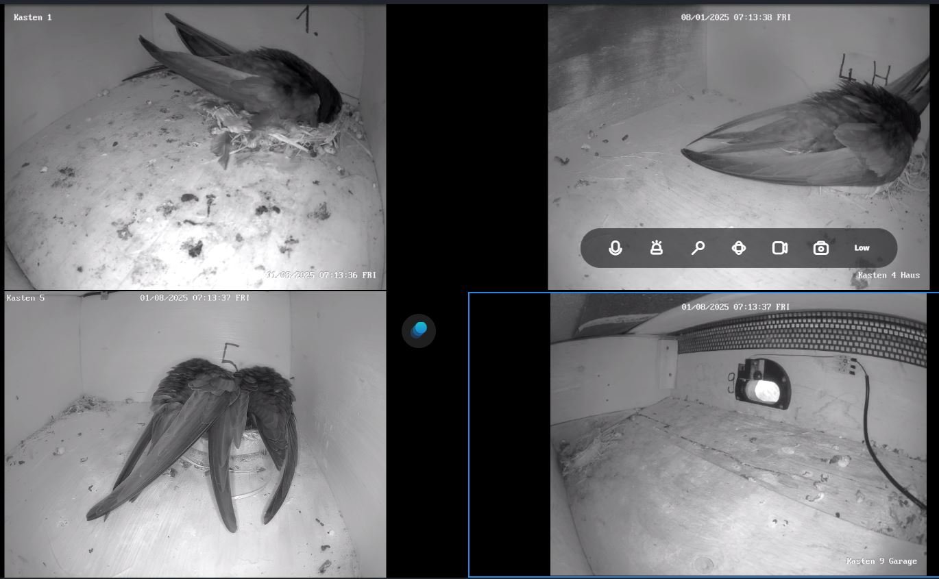 In anderen vier externen Kästen müssen auch noch Jungvögel sein,dem Verhalten der Altvögel am Abend nach zu urteilen