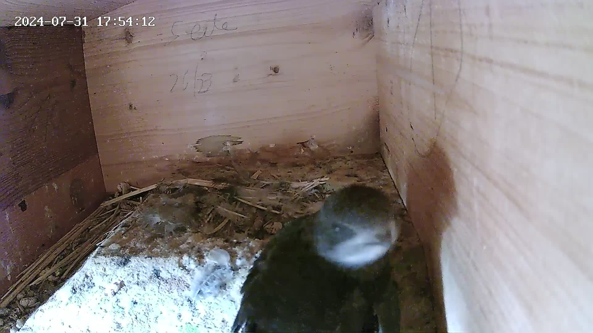 Durch die von den Flugübungen fettig gewordene Kameralinse wurde die Aufnahme nebelig, was mich heute leider dazu verleitet hat, den Kasten kurz zu öffnen und schnell die Linse abzuwischen. Das bereue ich inzwischen und würde es - ohne Not - nicht wieder tun, denn die Schockstarre der JV dauerte sehr lange (30+50 Min.), das hätte ich ihnen ersparen sollen… Ich fürchtete schon, dass sie einen Herzinfarkt erlitten haben und war sehr erleichtert, als sie sich endlich wieder bewegten. LG, Regina