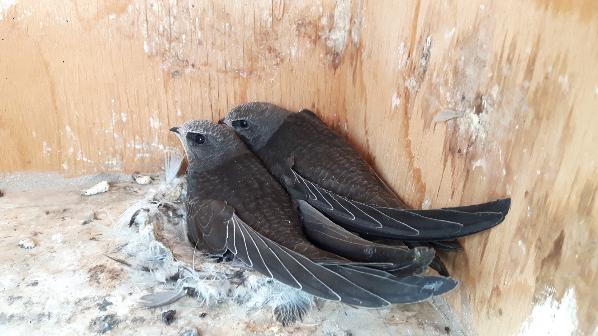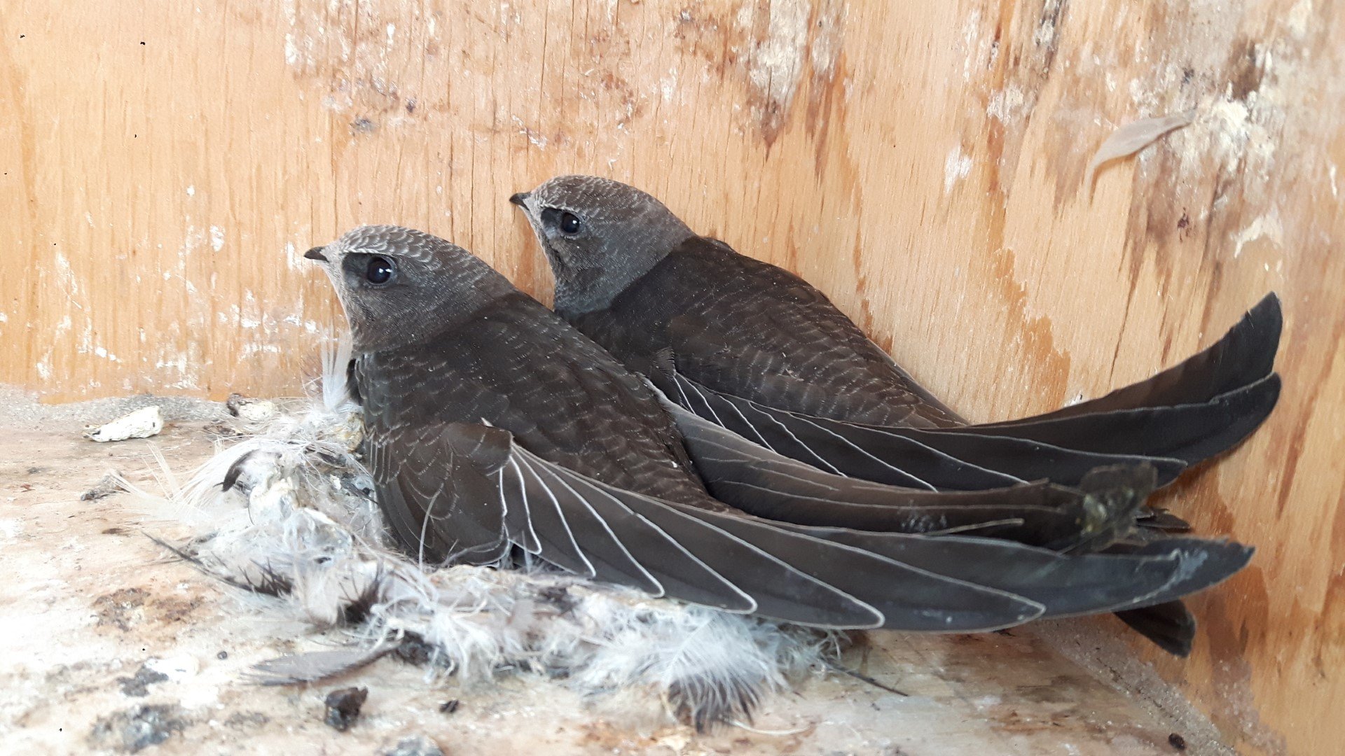 Da bist Du nun in einer Situation, vor der ich jedes Jahr ab Anfang August etwas Angst habe. Natürlich kann ich von hier aus keine Ferndiagnose stellen. Das Gewicht wissen wir nicht, aber die sehen zumindest gut aus. Wenn sie Geschwister des JV sind, der zuletzt bei Dir gestartet ist, werden sie sehr bald folgen. Was die Schwungfederspitzen des Seglers vorn im Bild betrifft, so scheint nur die jeweils längste auf jeder Seite betroffen zu sein. Es wirkt für mich auch so, als seien sie "nur" durch Kot verschmutzt, was ja bei der fehlenden Reinigung des Kastens durch die Eltern auch leichter passieren kann. Das sollte sich beim ersten Regen, den der JV durchfliegt, von selbst erledigen (wenn nicht der JV das noch vor dem Ausfliegen selber reinigt und auch die aufgespaltene Spitze in Ordnung bringt).