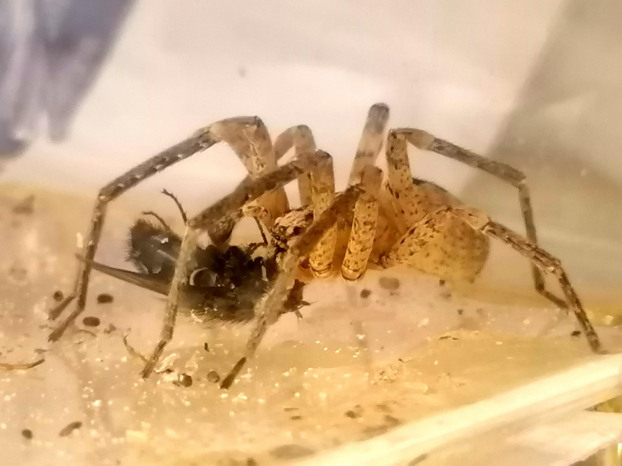 Weil diese Fliege in der Box nur am Boden krabbelte, war es für die hungriges Spinne kein Problem sie zu fangen.