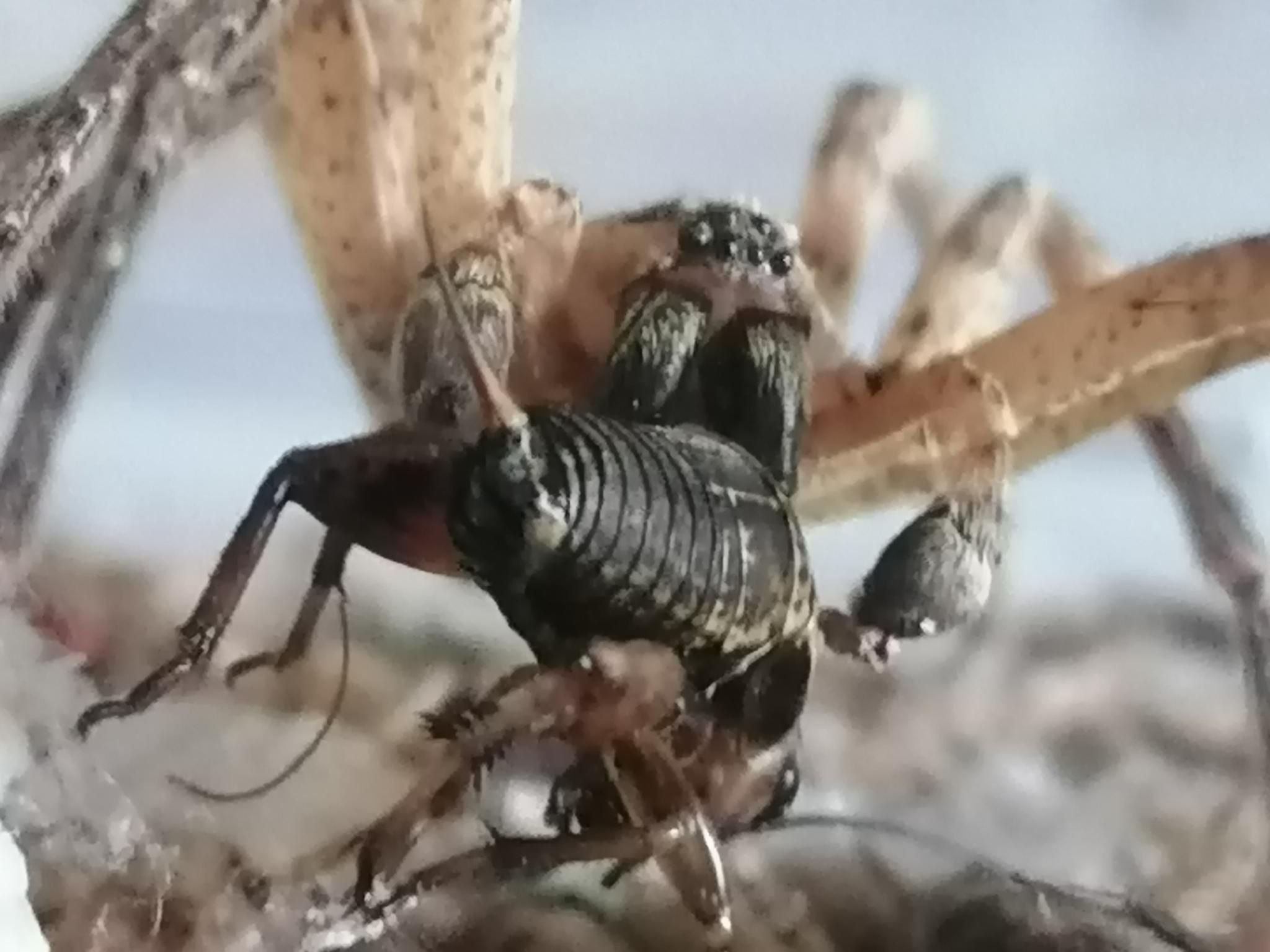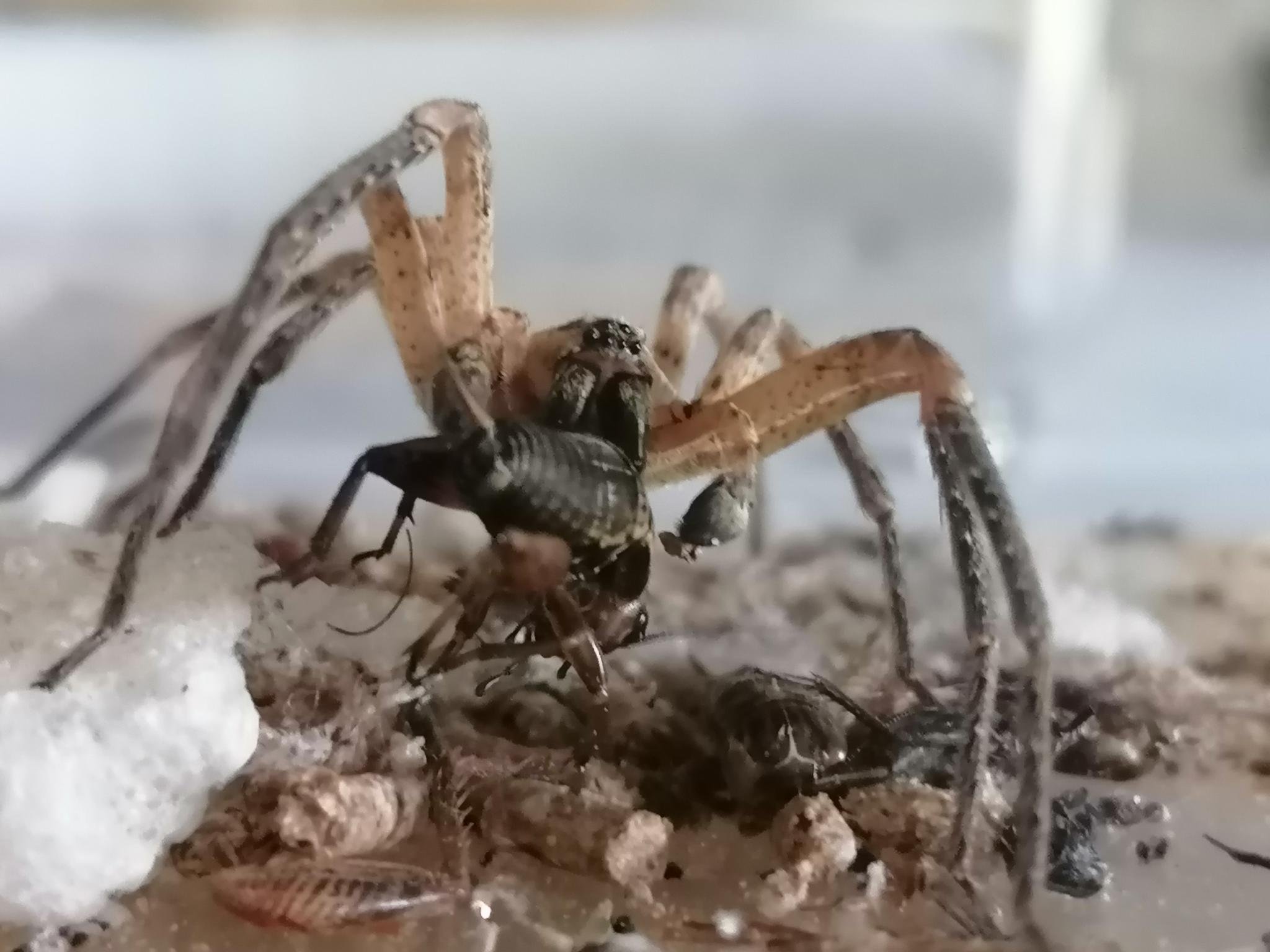 Schon seit zwei Tagen warte ich auch darauf, dass´sich das Spinnenmännchen eine der größeren Grillen fängt und heute ist es passiert. Somit werde ich auch das Männchen morgen frei lassen.
