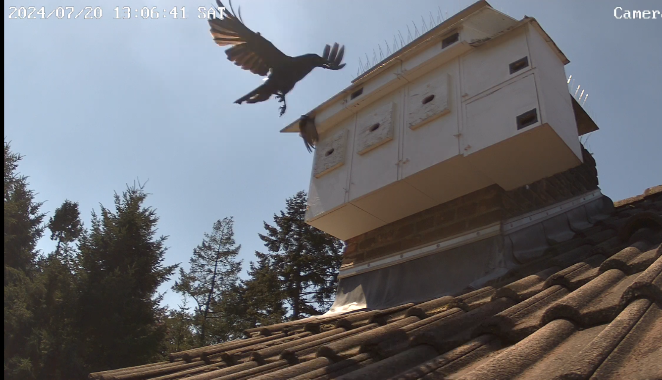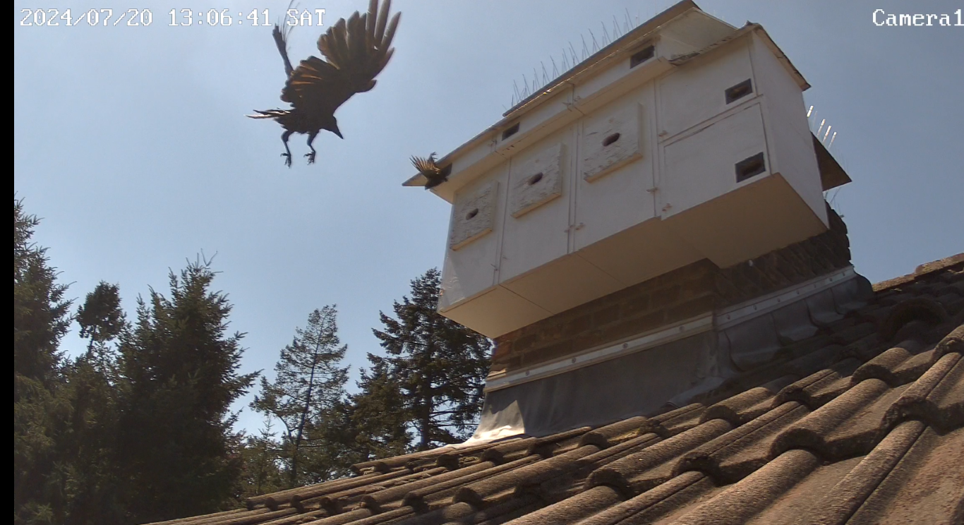 Der Segler hing erst ein paar Sekunden am Einflug, als aus dem Nichts schon der schwarze Schatten da war. Glücklicherweise habe ich reflexartig reagiert, geschrien, geklatscht und mit den Armen gerudert was die Krähe etwas irritiert hat und vom direkten Zufassen abgehalten hat. Trotzdem drehte sie sich in der Luft und wollte sofort wieder angreifen worauf ich meine Aktivität und Lautstärke steigerte was die Krähe dann zum Abdrehen veranlasste. Das hat mir die Sekunden verschafft, auf den Dachboden zu sprinten. Als mein Konterfei aus dem Dachfenster auftauchte, war die Krähe ausreichend verschreckt und verzog sich.