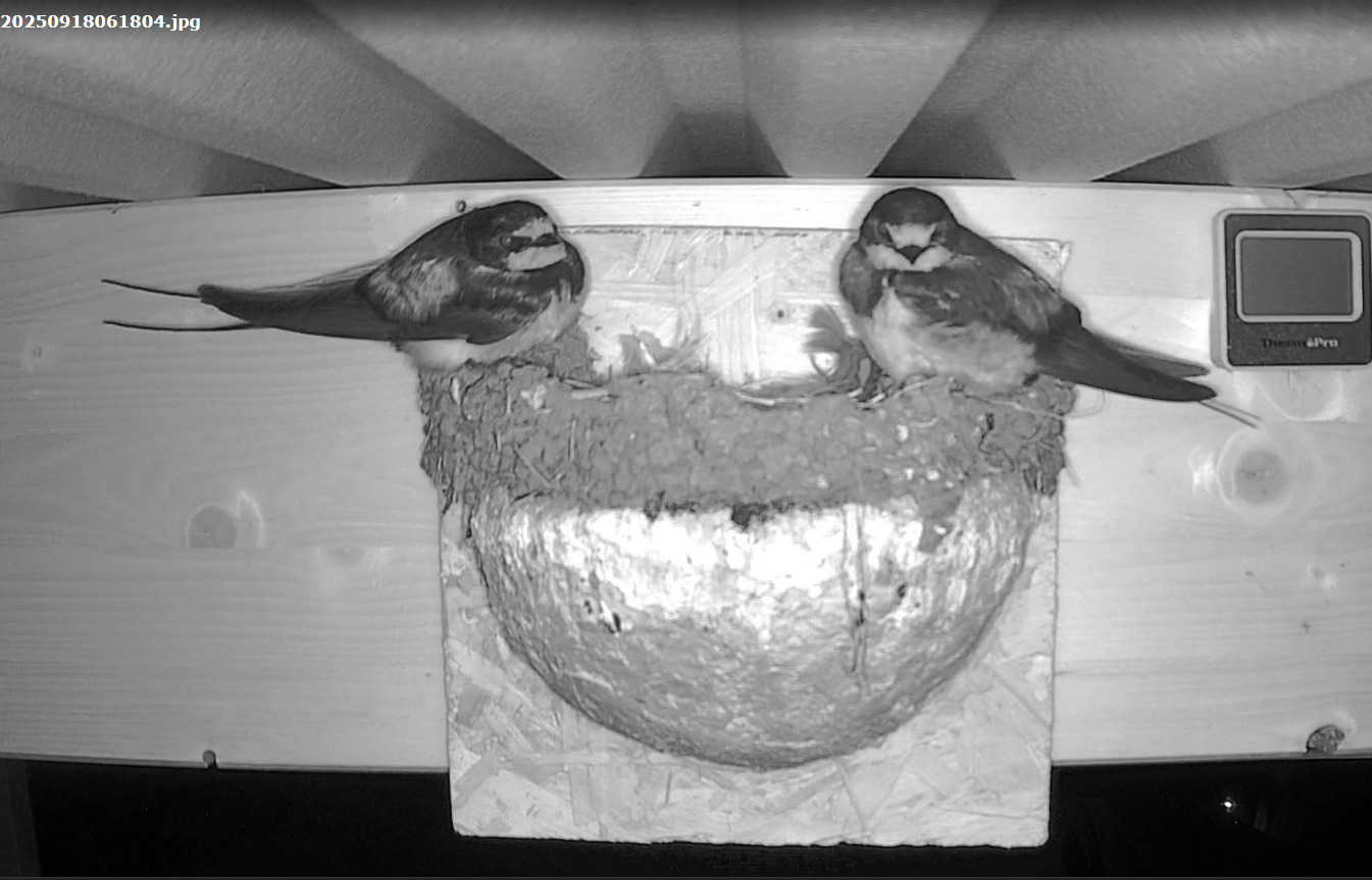Die beiden Jungvögel haben das Nest zuletzt in der Nacht von 3. zum 4. September benutzt. Ein AV (ich schätze, dass es das Männchen war) übernachtete am 4. September das letzte Mal dort. Vielleicht kam er nicht mehr, weil beide JV nicht zurückkehrten. Bei uns sehe ich nur noch vereinzelt Schwalben. In der nächsten Ortschaft sind noch ein paar Mehlschwalben. Ansonsten tummeln sich die Blaumeisen in unserem Garten ... freue mich auch hier jedes Jahr über die tollen Bruterfolge bei uns (waschbär- und katzensicher!)