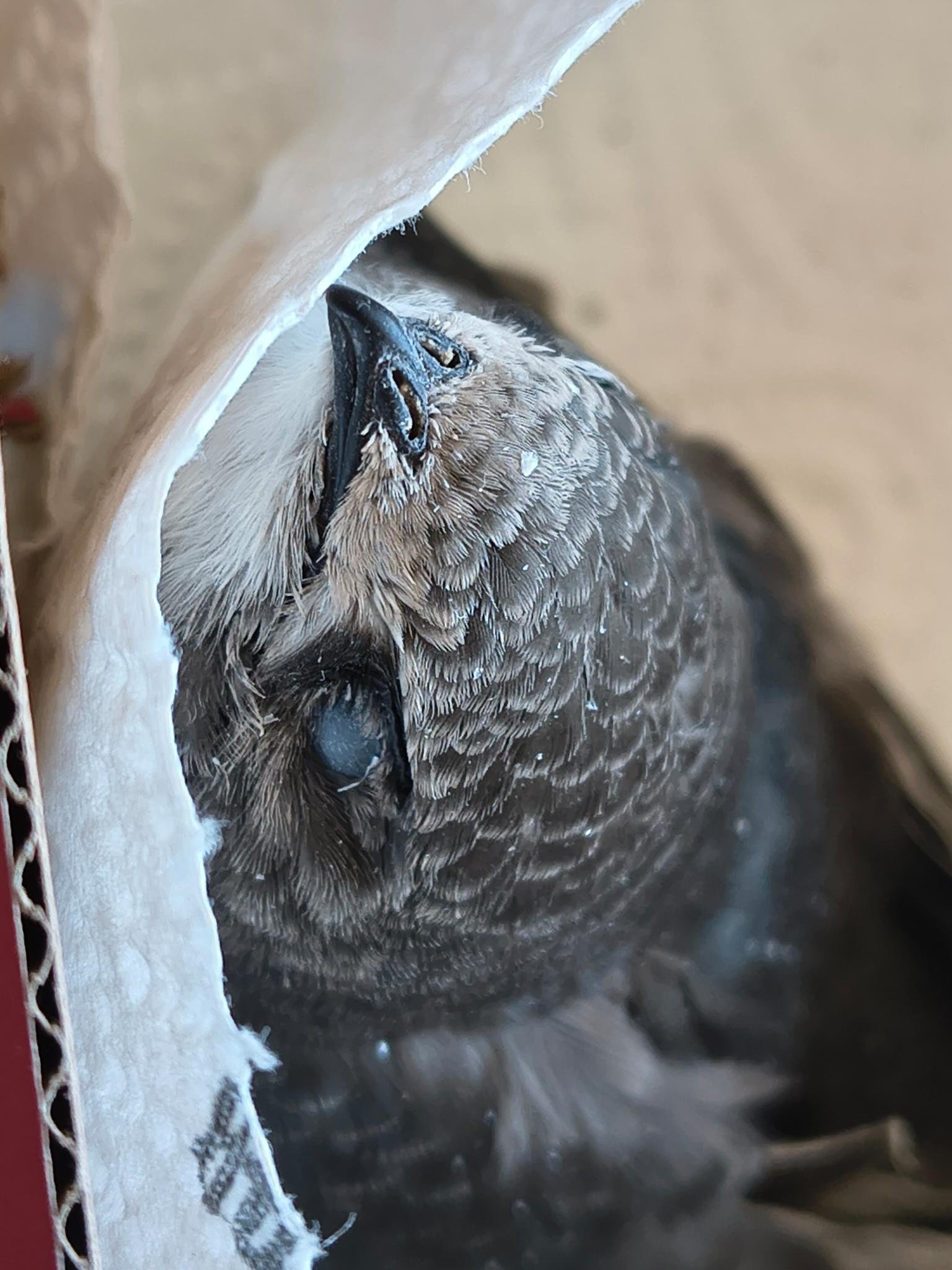Es ist kräftig, aber sehr schreckhaft und klopft heftig mit einem Flügel, wenn ich den Karton öffne.