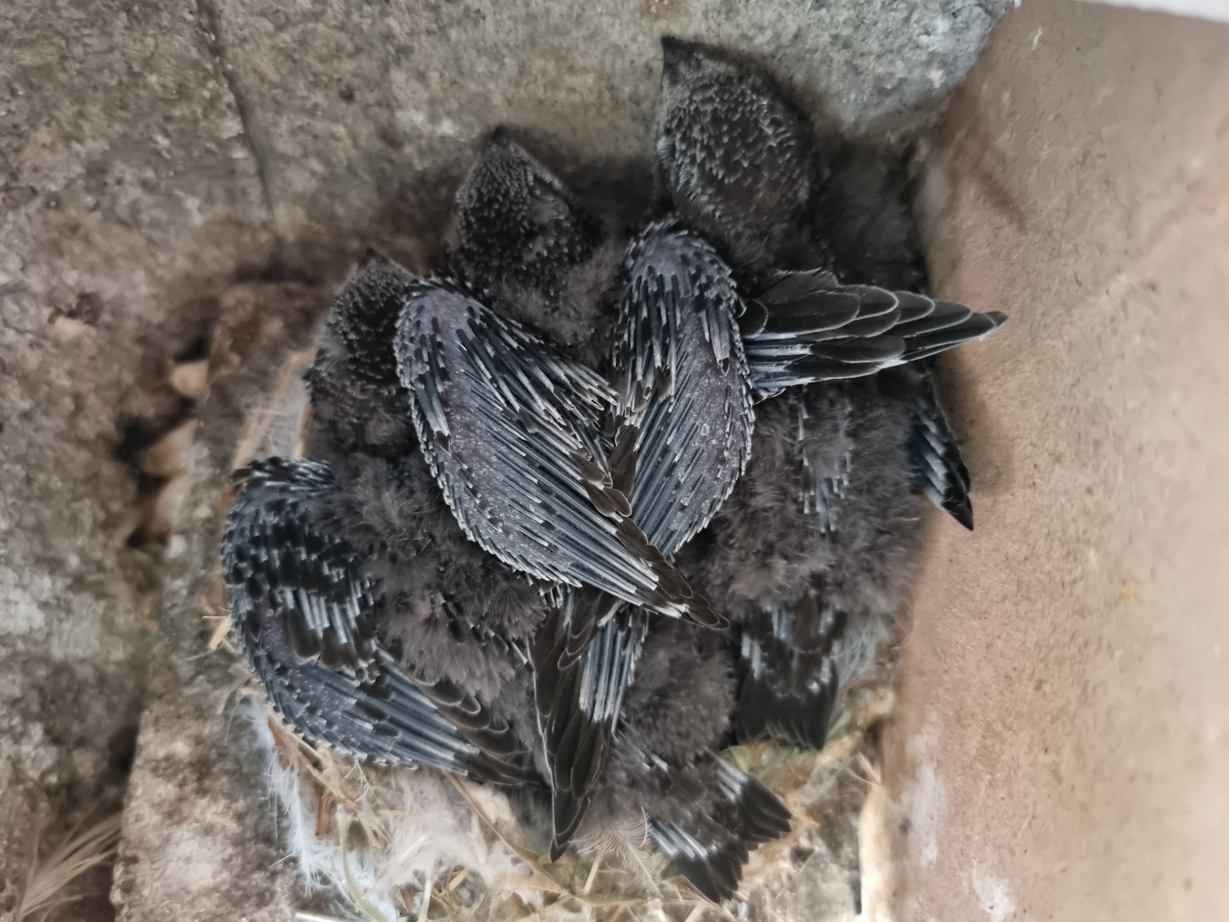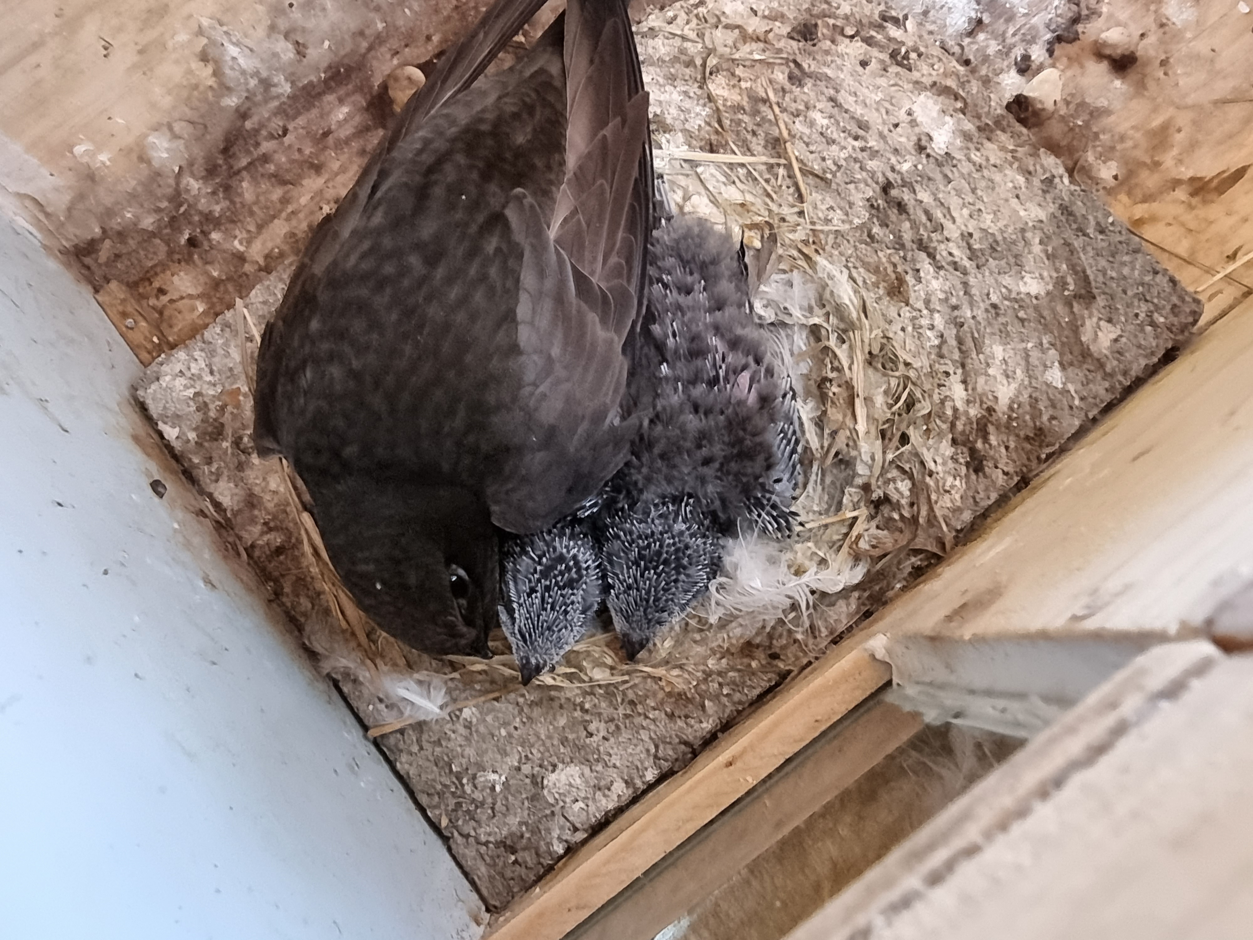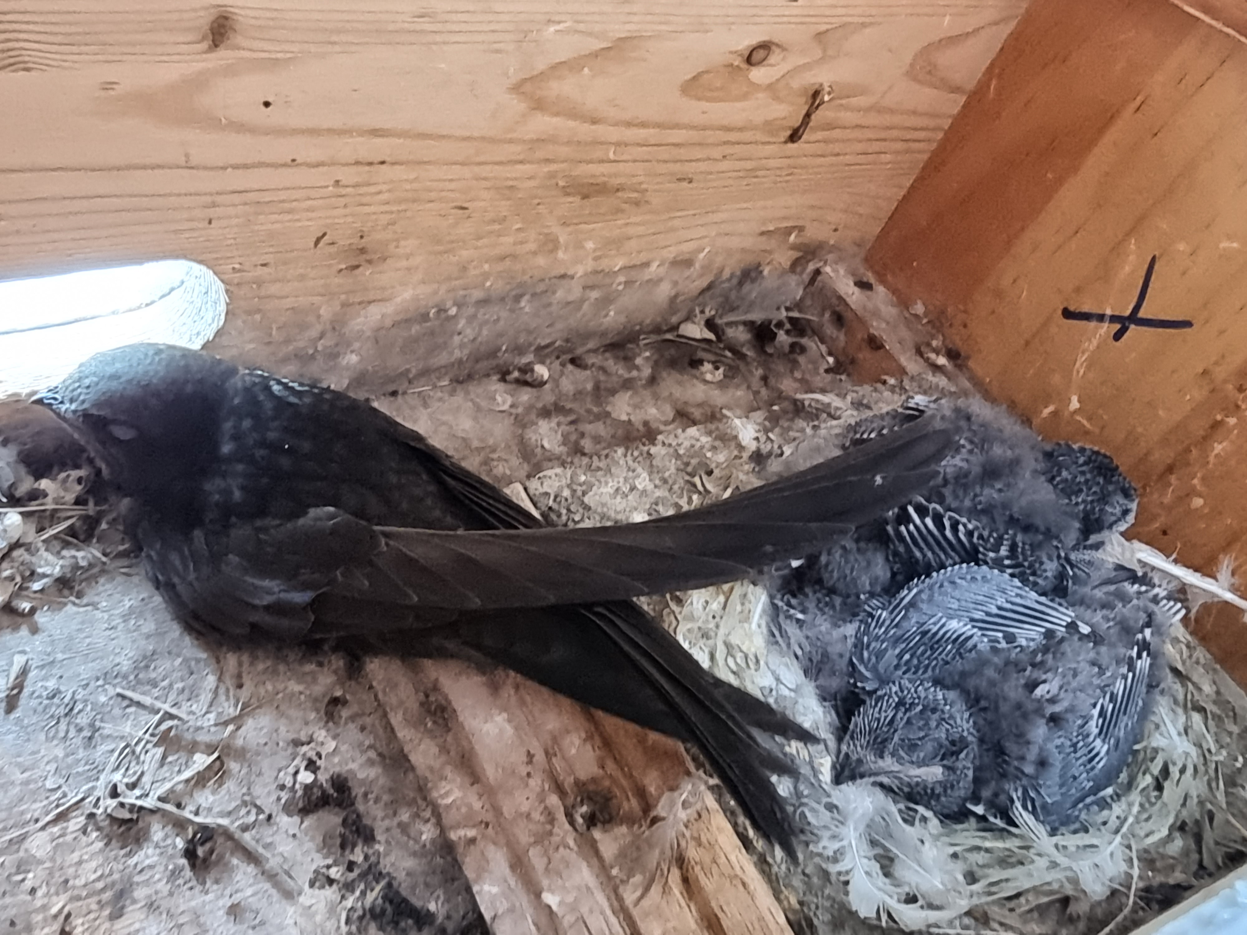 Ich lass die dann gewähren. Hier hat auch ein Star einen Kasten übernommen, die Segler mussten sich gedulden bis die Brut hoch war. Für den Star war die Aufzucht Stress pur!