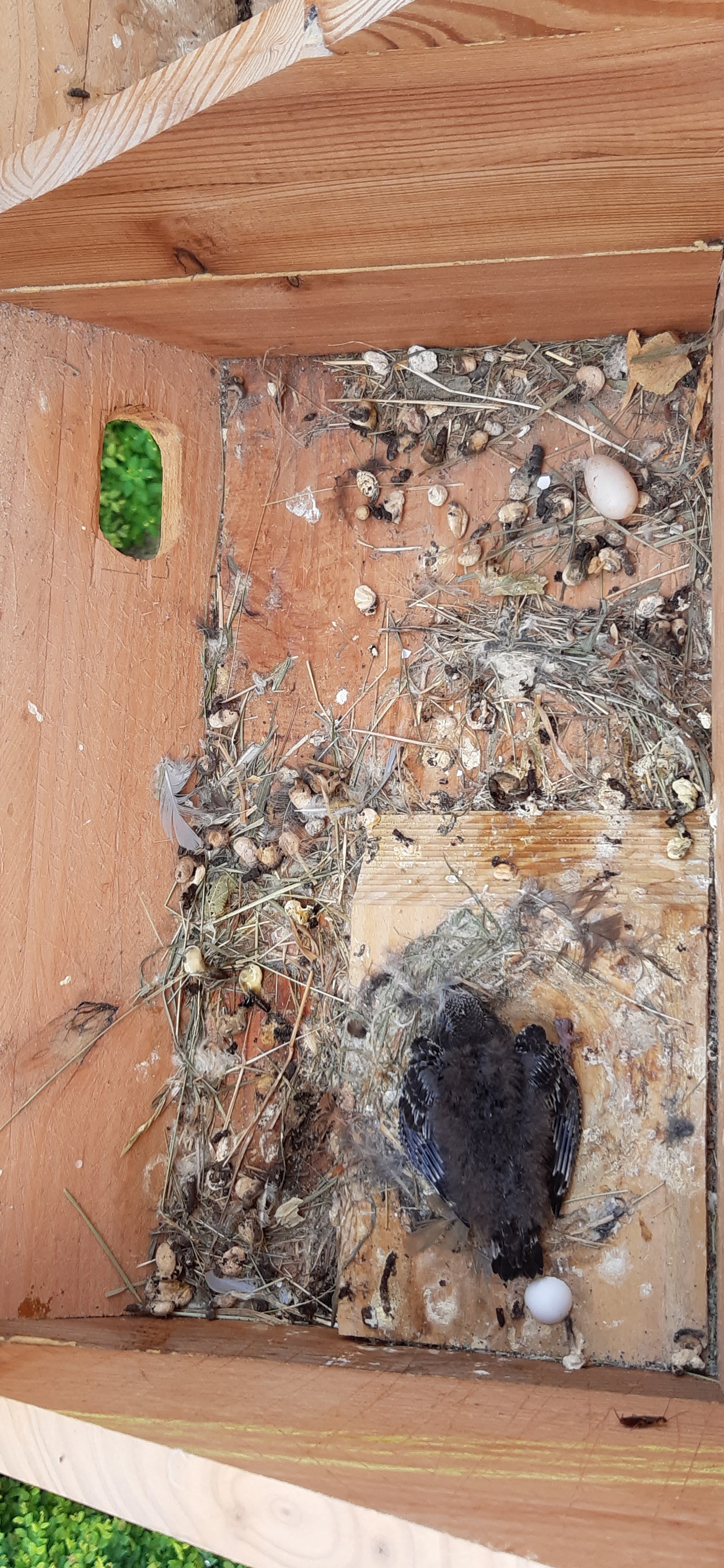 Das Ms-Paar hat zwei Eier gelegt und anschließend aus dem Nest gekegelt. Ich hab die Eier zweimal zurückgelegt. Beim Durchleuchten schien eins unbefruchtet. Nach der zweiten Rücklegeaktion lag ein Ei auf der Terasse und eins wiederum auserhalb. Das wars für mich.