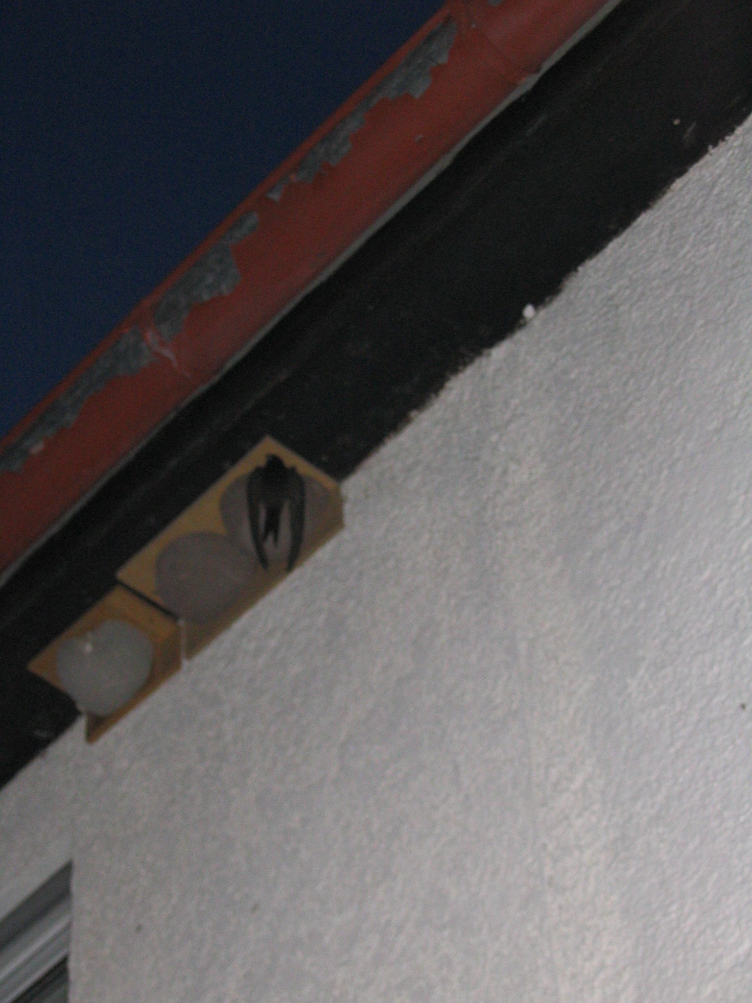 Je nach Größe der Mehlschwalben-Kunstnester passt ein Segler durchaus auch in ein solches. Mein erster Segler der unser Haus und mich ausgesucht hat (ich hatte mich zuvor gar nicht mit den Seglern beschäftigt) quetschte sich in ein selbiges und übernachtete auch darin. Zum Glück schaffte er es auch wieder raus und bekam am selben Tag einen Kasten von meinem Mann gebastelt mit von mir modellierter Frontplatte. Der Segler kam am Abend zurück und flog in die dem Schwalbennest nachempfundene Einflugöffnung ein. Der angelernte Parnter nahm von Anfang an die untere Einflugöffnung. Es erfolgte gleich in diesem Jahr eine erfolgreiche Spätbrut. So nahm meine Kolonie ihren Anfang... :rolleyes: