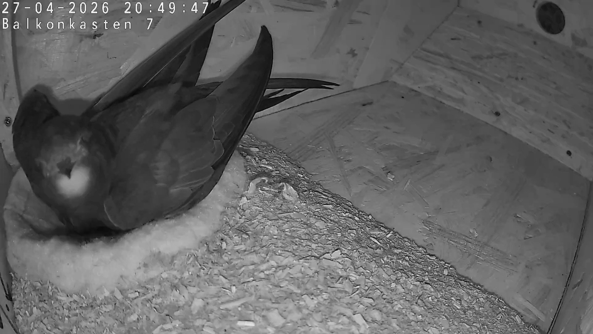 Ich war vielleicht ein bisschen voreilig, aber wirklich nur ein bisschen. Nachdem fünf meier acht Segler gegen 20:20 Uhr zu einer letzten Runde starteten, waren auf einmal mehr als fünf Segler am Himmel. Ich hatte schon vorher gemeint, leise Rufe aus dem Naturnest am Nachbarhaus gehört zu haben. Tatsächlich sah ich aus dem Augenwinkel einen Schatten dort einfliegen. Noch überraschender flog dann ein Segler im mittleren Fach des Wandkasten ein. Also ein Segler mehr in der Kolonie. Immer für eine Anekdote gut: das Mixed-Paar aus BK 4 und 10. Sie haben offensichtlich einen Kompromiss gefunden und schlafen heute in BK 7 (einer mit dem neuartigen runden Einflug). Ich bin gespannt, wann endlich die Partner kommen.