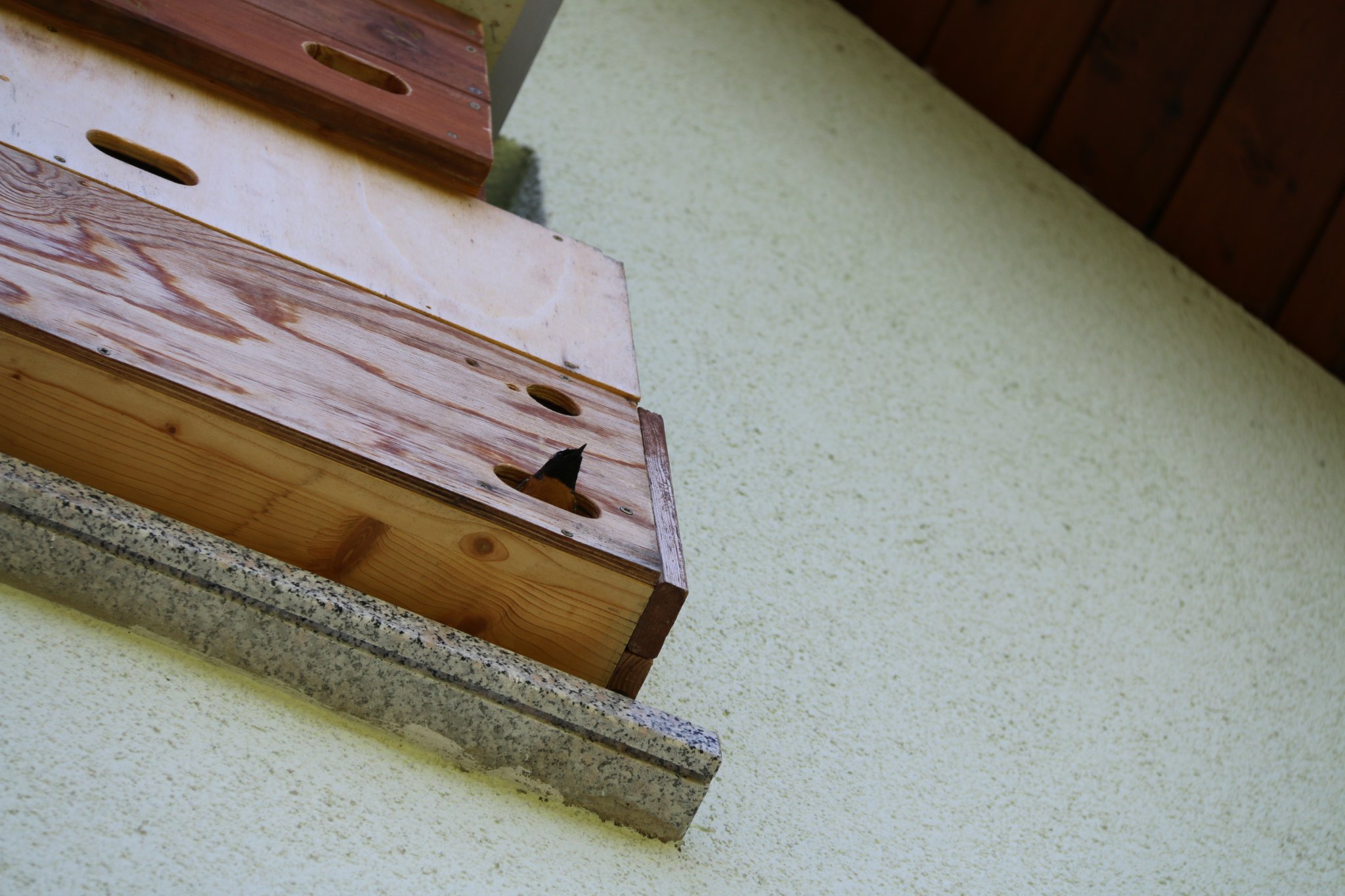 Die Rotschwänzchen haben ihre Halbhöhle auf meinem Balkon endlich entdeckt und das Weibchen ist seit gestern sehr fleißig beim Nestbau. Heute hat sie schon Federn für die Polsterung eingetragen.