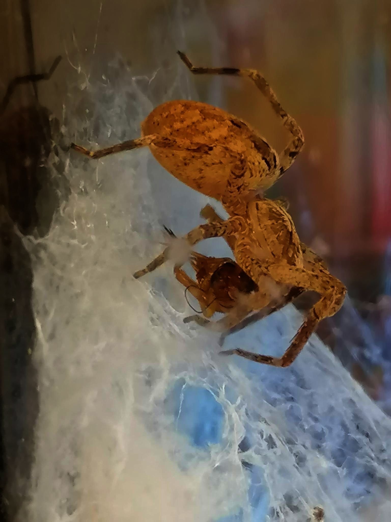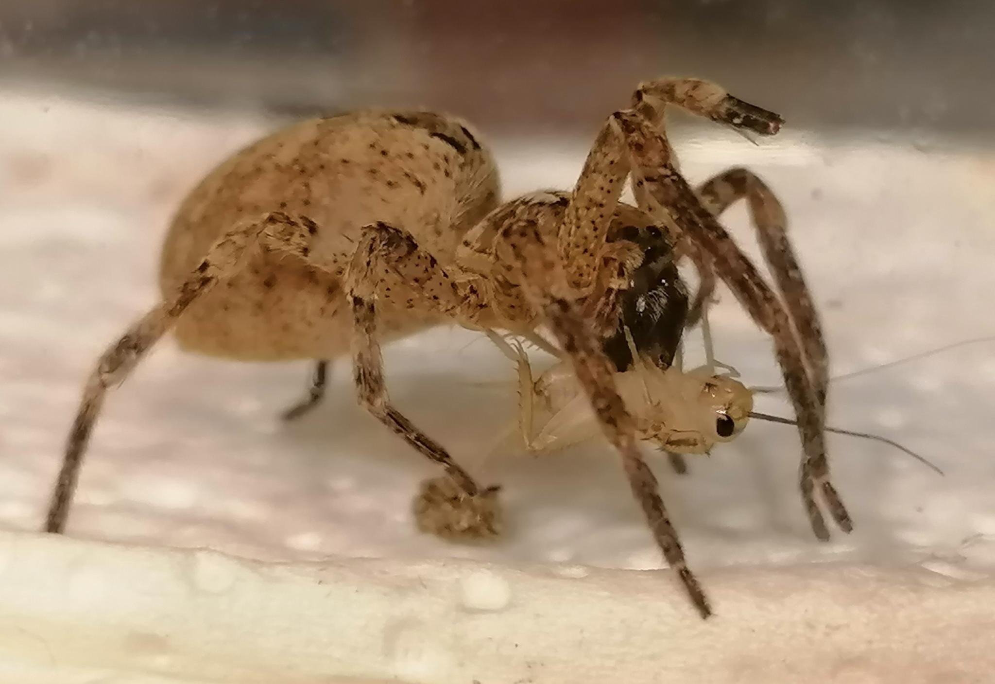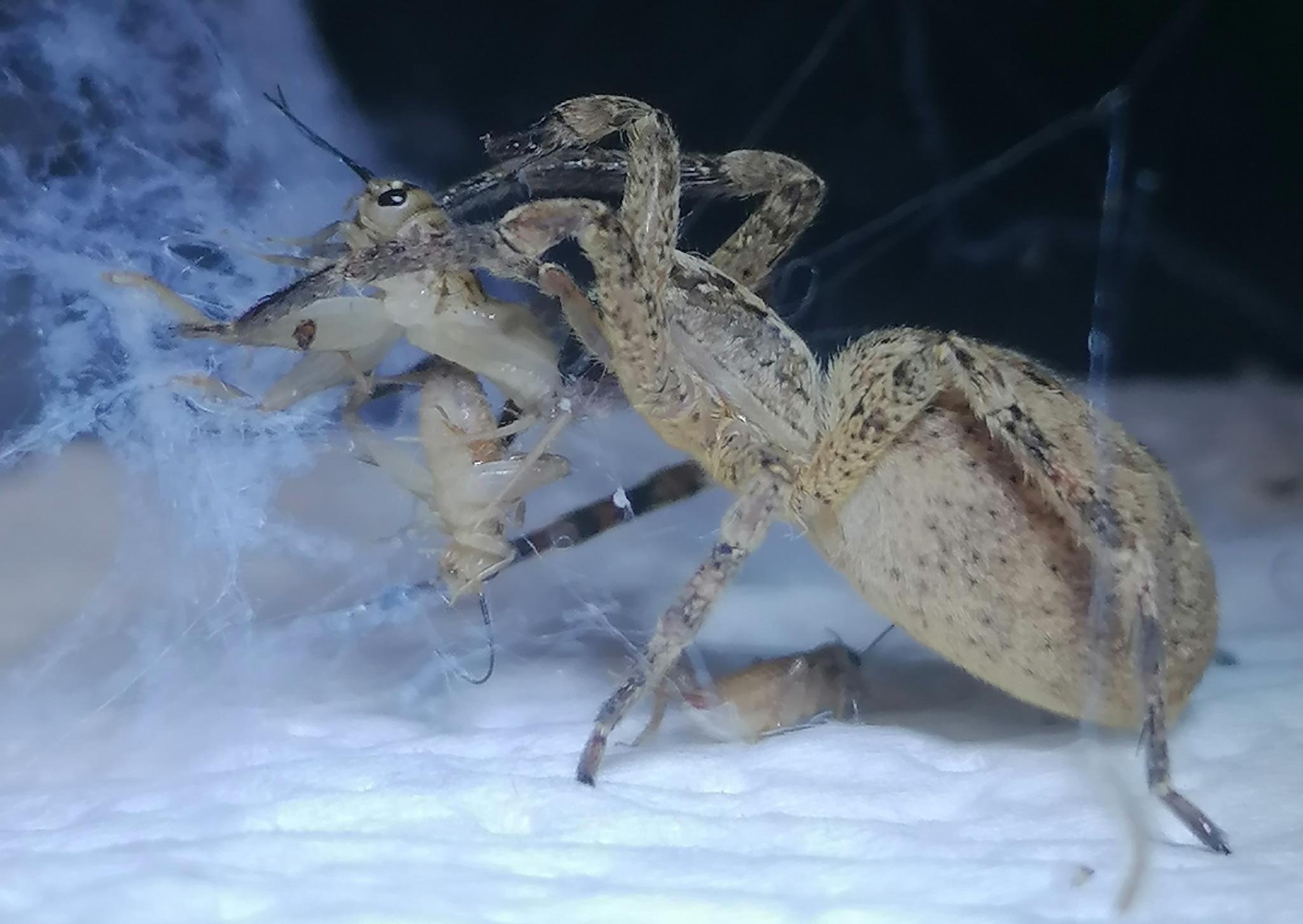 Gestern habe ich der Spinne drei neue Heimchen gleichzeitig in die Box gesetzt, sie hat sofort darauf reagiert. Das ERSTE kleine Heimchen ergriffen und betäubt, dann auch noch das ZWEITE und nach einer Pause auch noch das größere DRITTE, das sich im Netz vom ZELT verfangen hatte.