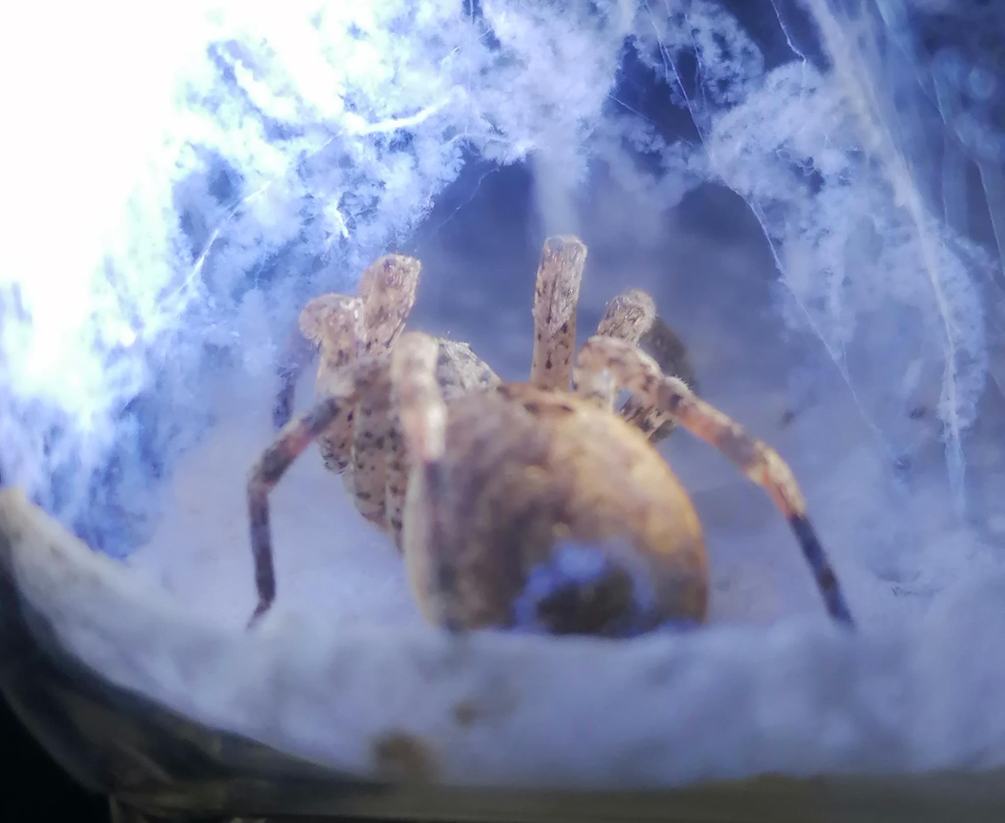 Deshalb ist es inzwischen schwierig die Box so zu stellen und zu beleuchten, dass trotz des dichten Gespinst zu erkennen ist was sie macht, ohne die Spinne bei dem was sie macht zu stören.