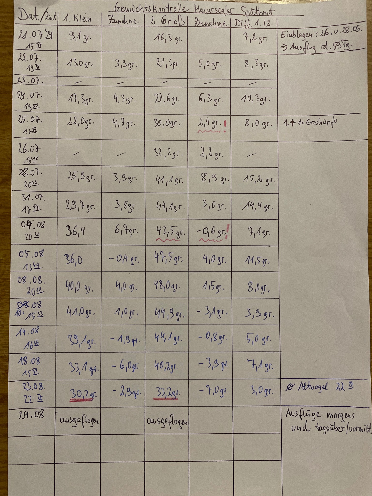 Bis heute mache ich mir Gedanken ob er es geschaft hat, da er nur 33 Gramm hatte. Da es bei dir ähnlich gelaufen ist bin ich guter Dinge das der Kleine erfolgreich ausgeflogen ist. Bei dir hatten die Beiden zwischenzeitlich ein ordentliches Gewicht. Ich nahm an die Jungsegler sollten beim Ausflug mindestens so um die 40 Gramm haben. Offensichtlich geht es auch noch weit darunter.
