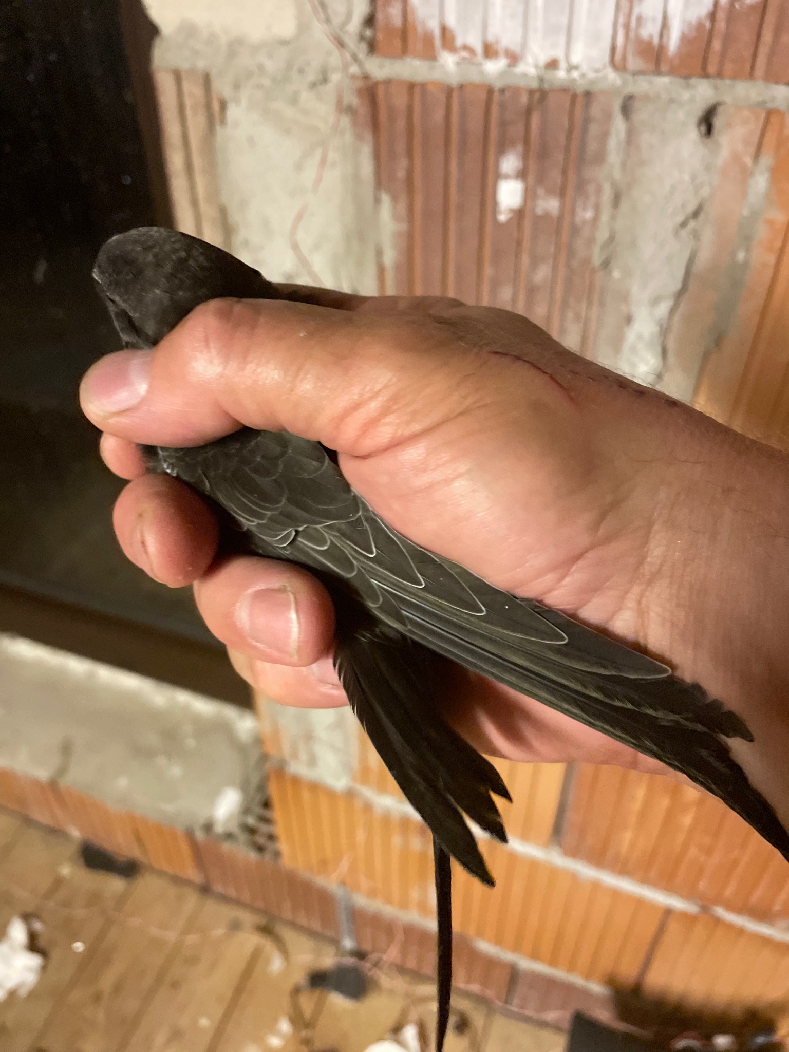 Am Samstag gegen 19:30 bekam ich aus einem 70 km entferntem Ort die Anfrage ob ich einen aus dem Nest gesprungenem MS- Jungvogel aufnehmen würde. Vorangegangen war, der JV war, mit einem anderen JV, unterhalb der Nisthilfe aufgefunden worden. Der andere JV war wohl, aufgrund der Verletzungen, die er sich durch den Sturz zugezogen hatte, verstorben. Bei der Kontrolle im Nest fand man einen weiteren toten Mauersegler.
