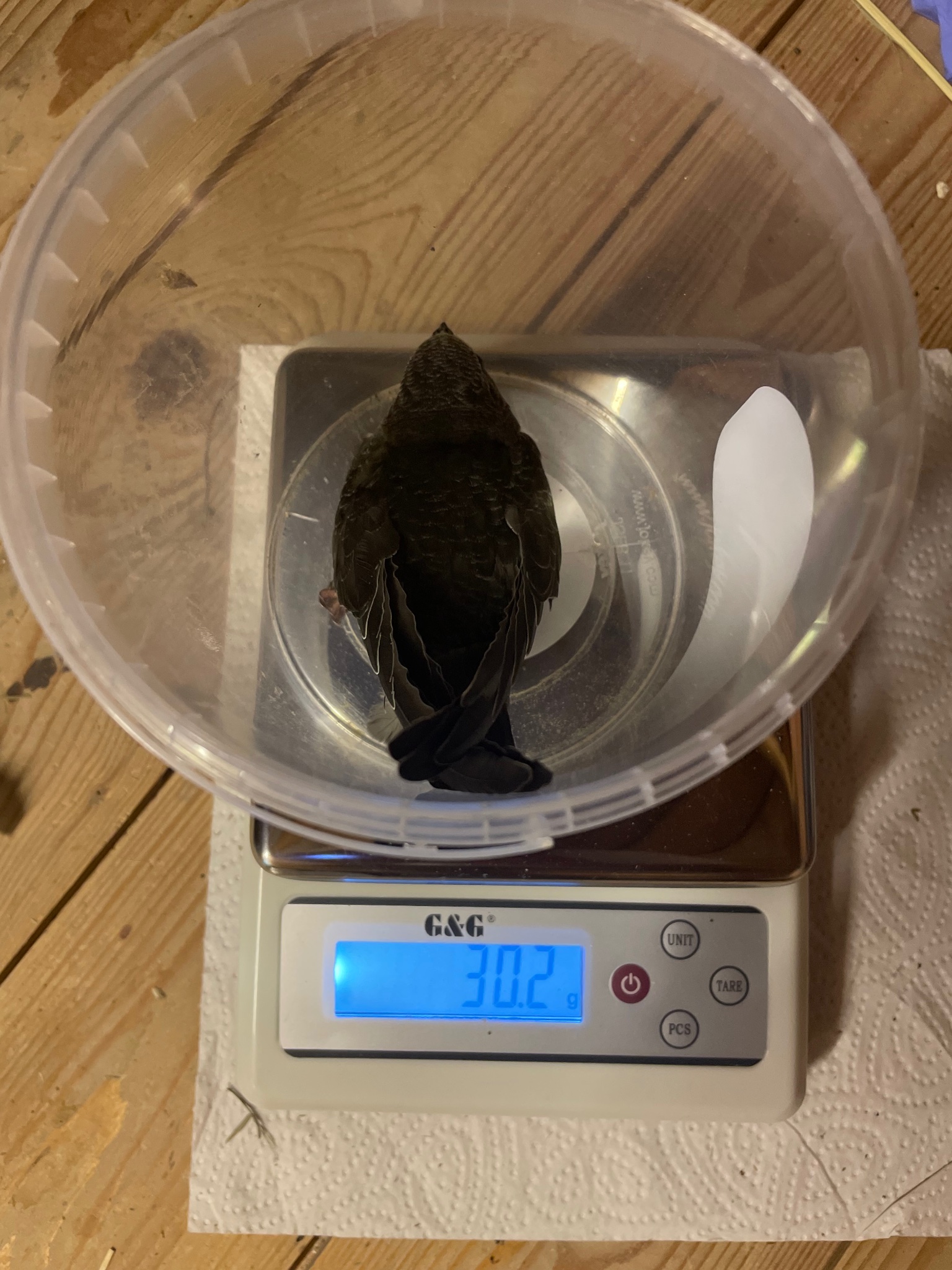 Als der erste Jungsegler dann ausgeflogen war und der zweite nach ca. drei Tagen immernoch im Kasten saß, habe ich ihn gewogen.