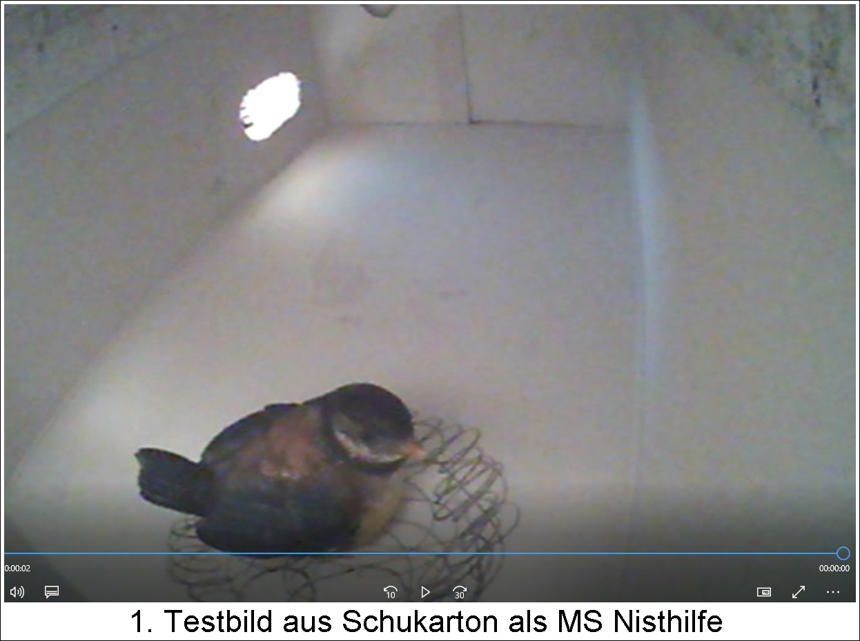die getestete Kamera mit Weitwinkelobjektiv scheint gut geeignet für eine MS Nisthilfe zu sein. Die Einbausituation habe ich noch einmal leicht modifiziert zur optimalen Einstellung, zum Teil auch von außen. siehe Bild