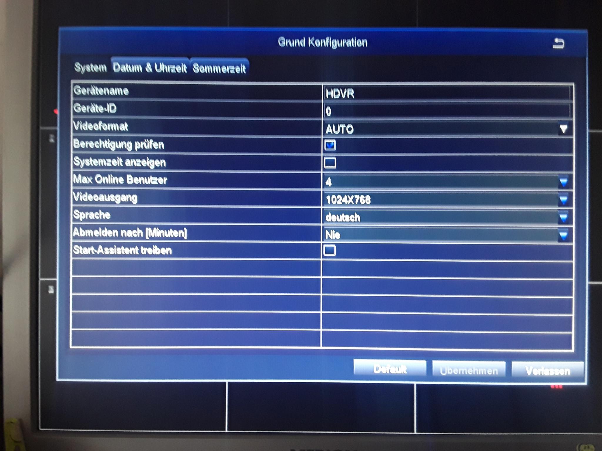 Hier können die Zeit, die Passwortabfrage, der Name und die Monitorausgabe eingestellt werden