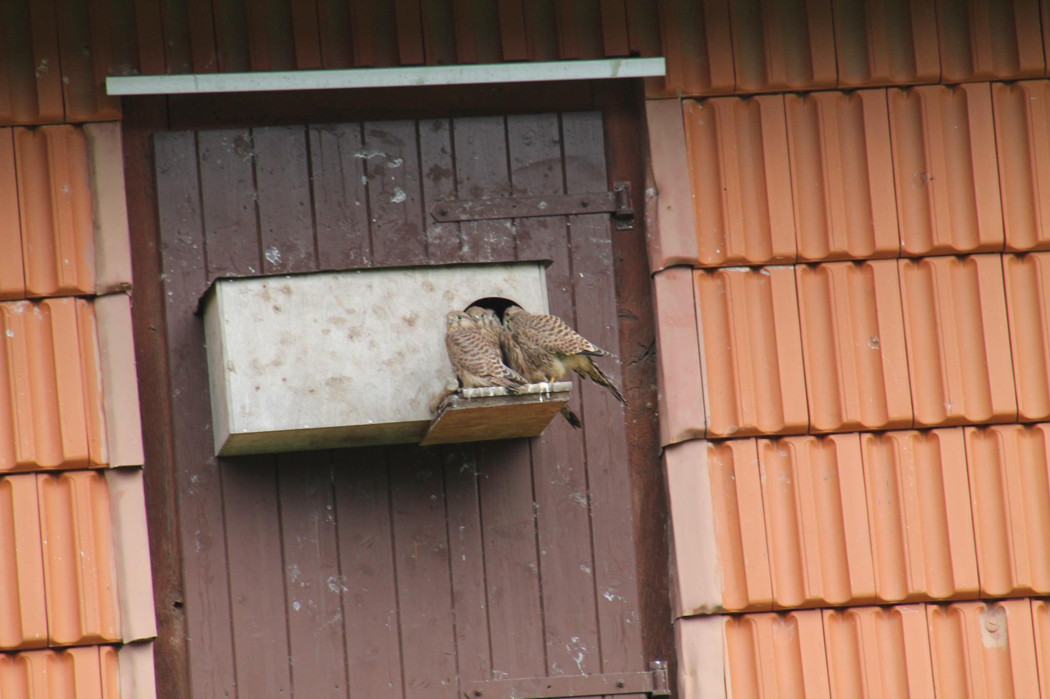 Die jungen Falken sind noch in der Nähe vom Haus und erschrecken die Sperlinge.