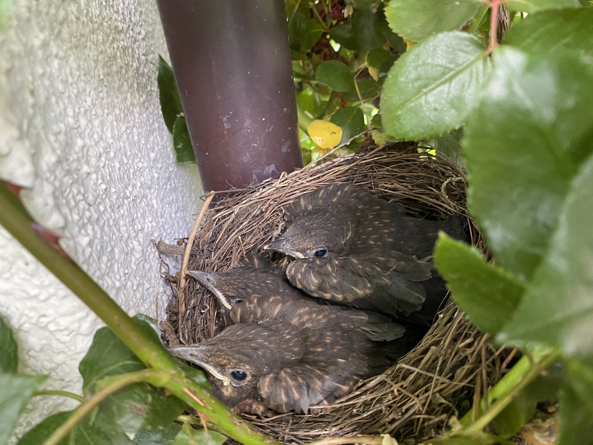 Jetzt steht die kleine Amsel gerade auf dem Nest und wird nach wie vor von beiden Amseleltern gefüttert. Sie ist sehr ruhig, auch beim Füttern nur leise Laute zu hören. Mir fiel auf, dass die Eltern nur immer sehr kleine Mengen im Schnabel haben, keine großen Regenwürmer oder ähnlich. Hier hat es immer mal wieder sehr ausgiebig geregnet und es ist alles saftig grün, aber vielleicht findet sich trotzdem nur wenig Futter. Werde morgen mal Amselfutter einkaufen gehen!