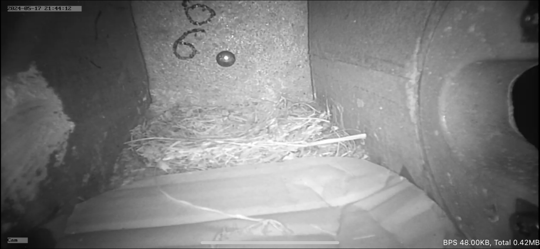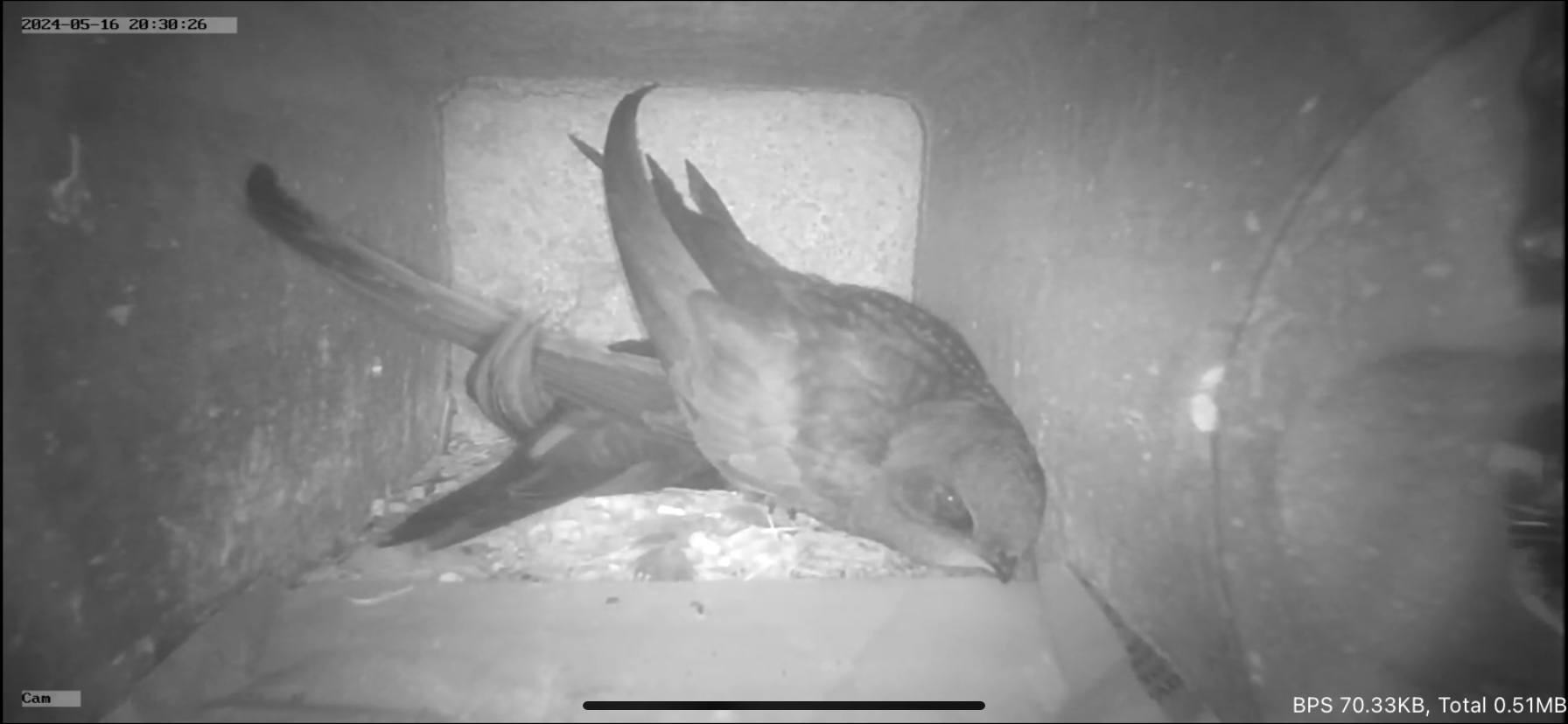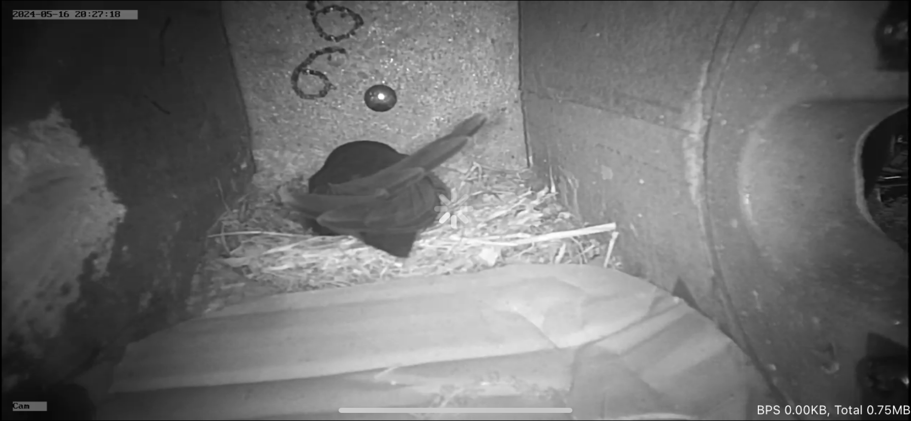 Vier erwartete Nistplätze sind noch leer. In einem davon hatte ein Single vom 8. Mai am 11. einen Partner gefunden. Luftübernachtungen in den beiden folgenden Nächten. Danach zeichnete die Kamera keine Bewegung mehr auf. Dafür scheint das VP im kleinen Starenkasten hinter der Regenrinne zurück zu sein.