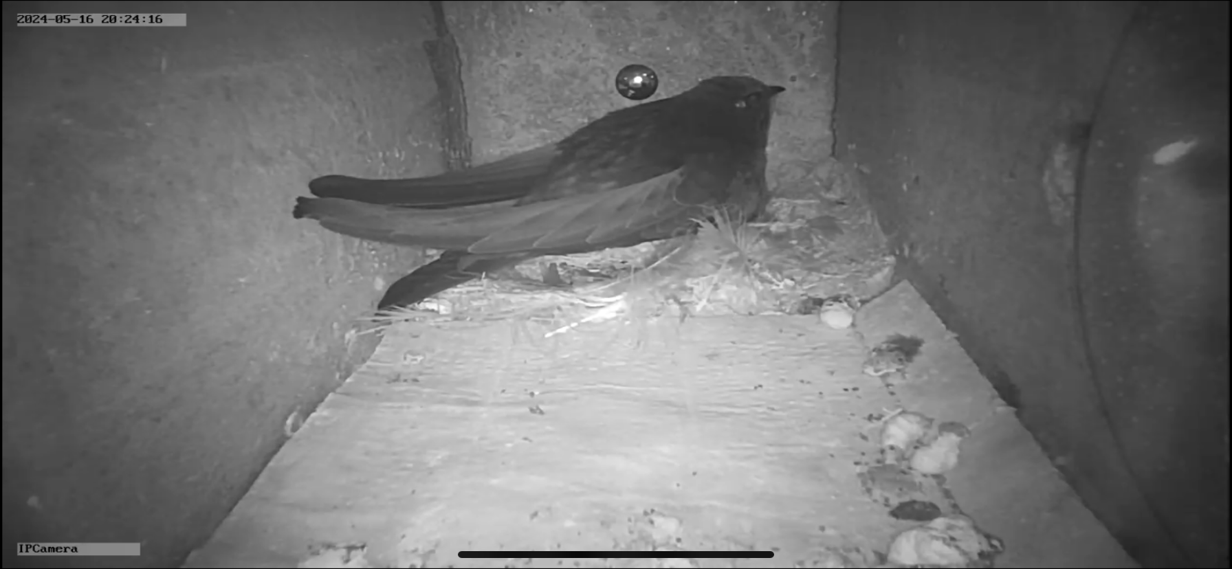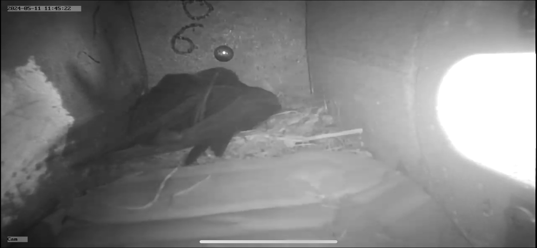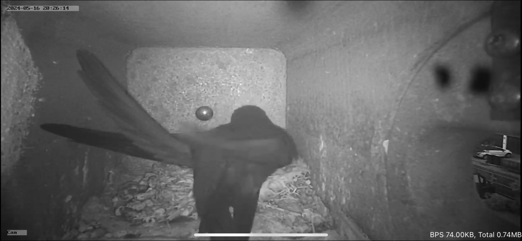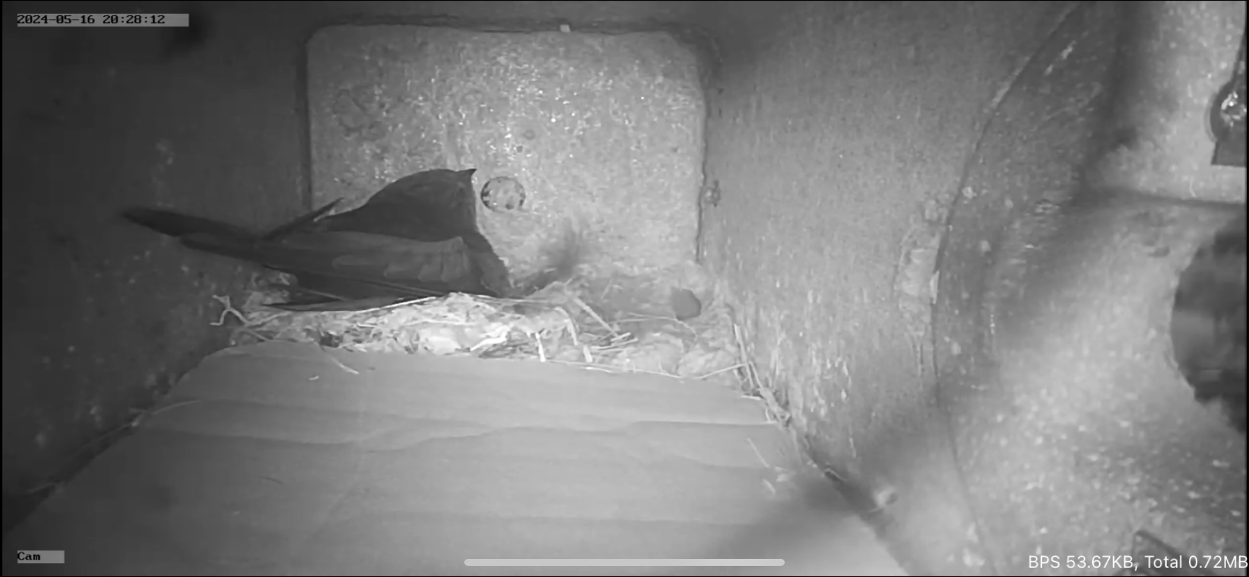 Vier erwartete Nistplätze sind noch leer. In einem davon hatte ein Single vom 8. Mai am 11. einen Partner gefunden. Luftübernachtungen in den beiden folgenden Nächten. Danach zeichnete die Kamera keine Bewegung mehr auf. Dafür scheint das VP im kleinen Starenkasten hinter der Regenrinne zurück zu sein.