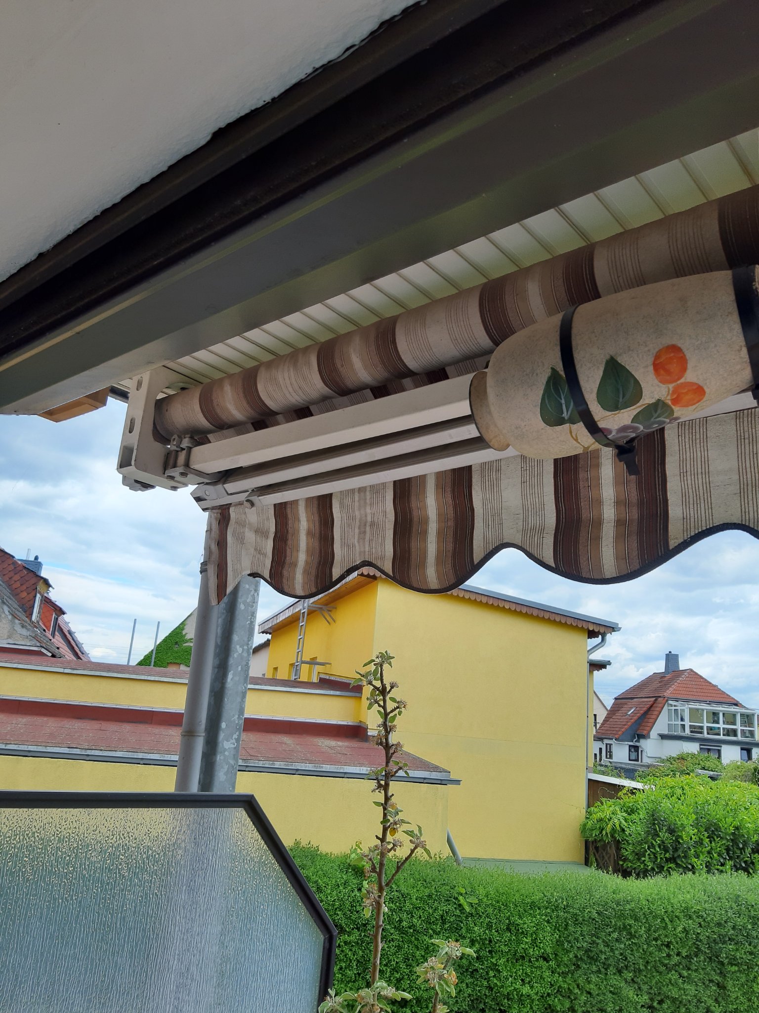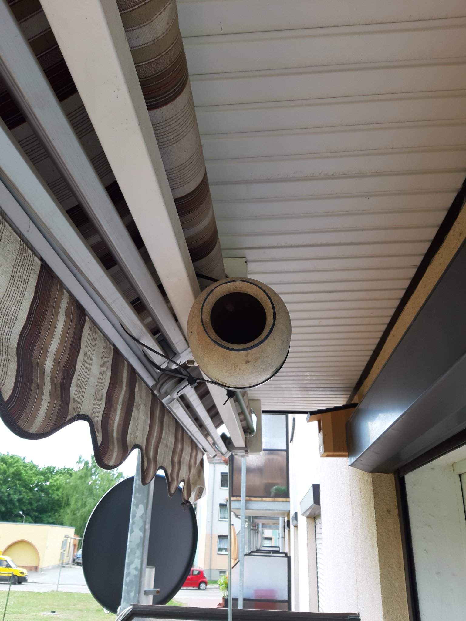 Ich bin auch nicht sicher, ob glasiertes Material angenommen wird, aber versuche es mal. Ob es jetzt so ganz in der Mitte vom Balkon gut hängt, weiß ich nicht. Vielleicht wäre der Einflug am äußersten Rand der Markise und nach außen gerichtet besser.