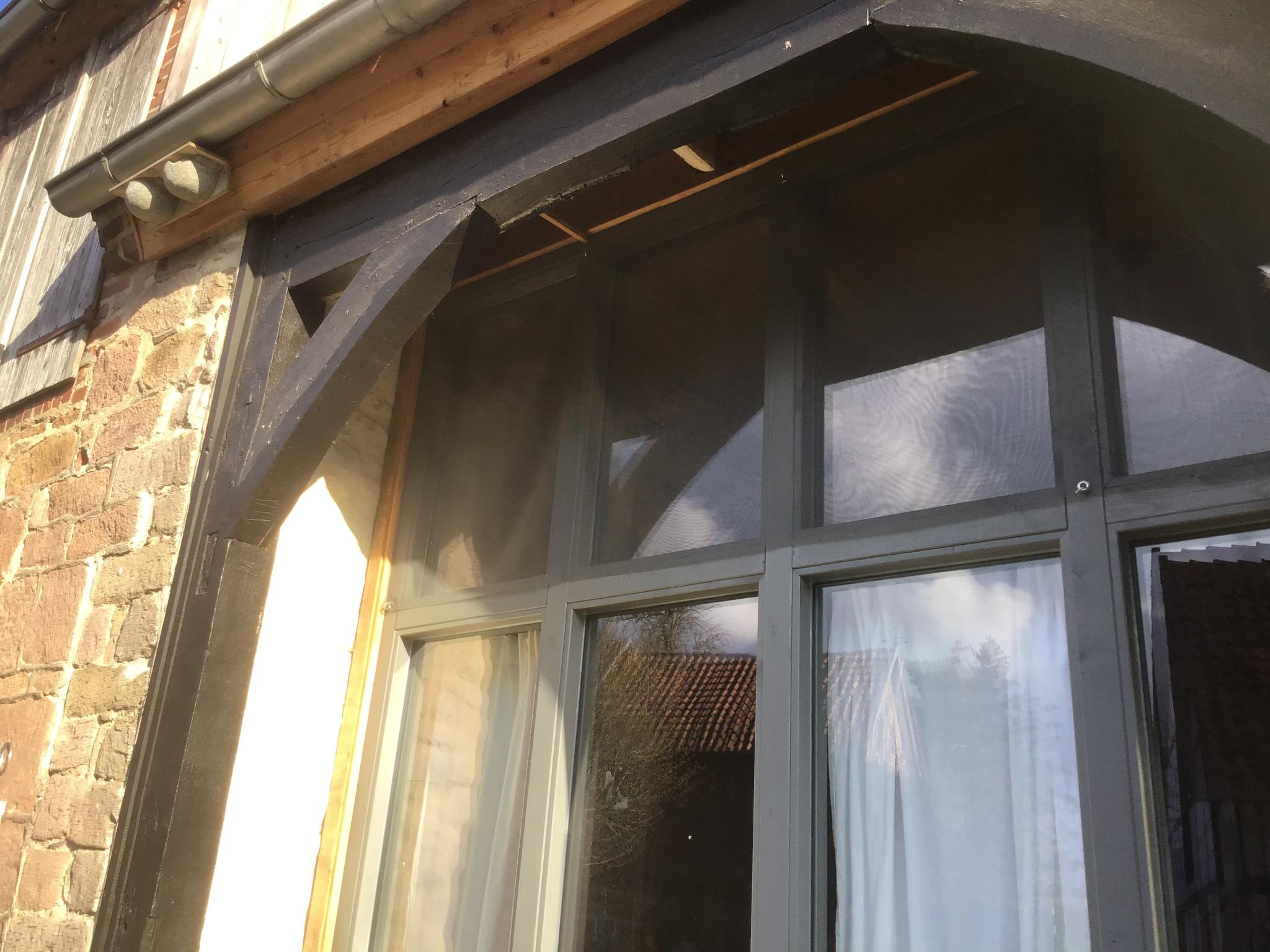 Beim Umbau einer Scheune oder eines Stalls kann man, sofern man auf ein paar Quadratmeter verzichtet, eine ganze Menge tun. Fenster und Türen kann man zurückgesetzt bauen. a) sieht besser aus, b) schafft oder erhält den Platz für Nester und c) wir können vom Sofa aus die Fütterung der Jungen beobachten.