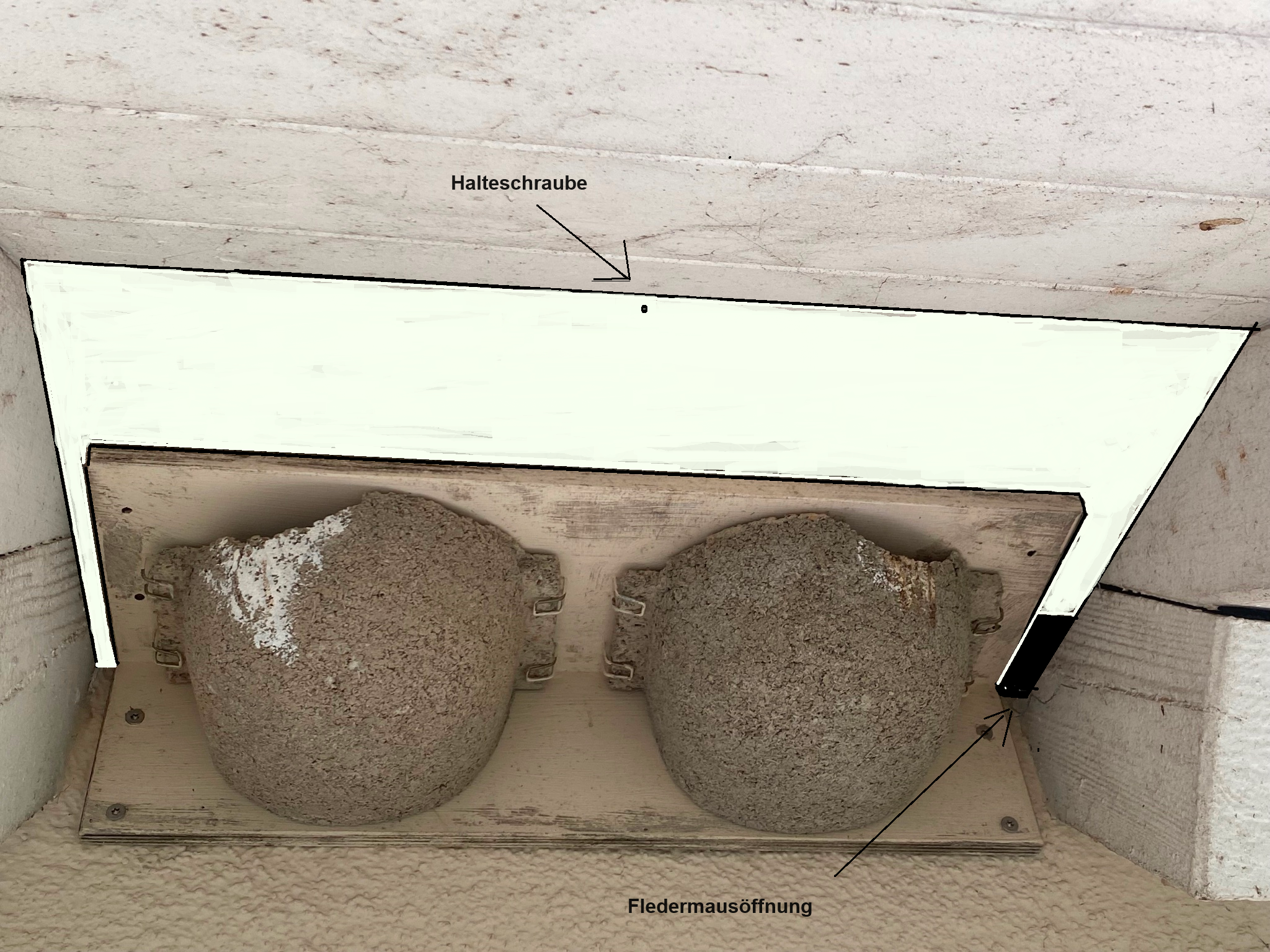 Melde mich noch einmal zu Deinem Spatzenproblem. Da habe ich einfach mal versucht, deinem Doppelnest das erwähnte fledermausfreundliche Brett zu verpassen. Wenn das so weit übersteht, dass es nicht ganz fest liegt, kannst du es mit einer (kleinen) Schraube am Dachüberstand befestigen.
