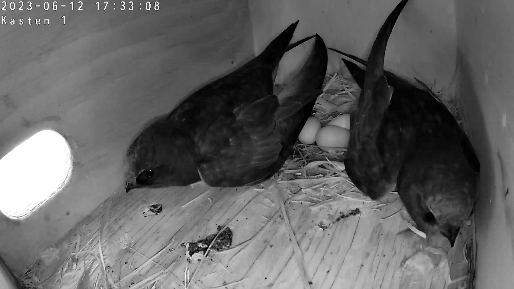 Es gibt bei vielen Vögeln den Reflex, ein Ei, dass nah am Nest liegt, wieder reinzurollen. Ich habe mich schon oft gefragt, ob es diesen Reflex bei Mauerseglern überhaupt gibt. Ich habe bisher angenommen, dass sie nicht versehentlich Eier ins Nest holen wollen, die da nicht hingehören, wie z.B. Stareneier oder weggeräumte Eier von Rivalen (sie müssen das ja oft bei kompletter Dunkelheit entscheiden). Jetzt zeigt sich, dass sie es doch können und manchmal ja wohl auch machen. Da stellt sich dann wohl die Frage, wie wir Nistmulden so bauen, dass ein unabsichtlich verrolltes Ei nah am Nestrand bleibt.
