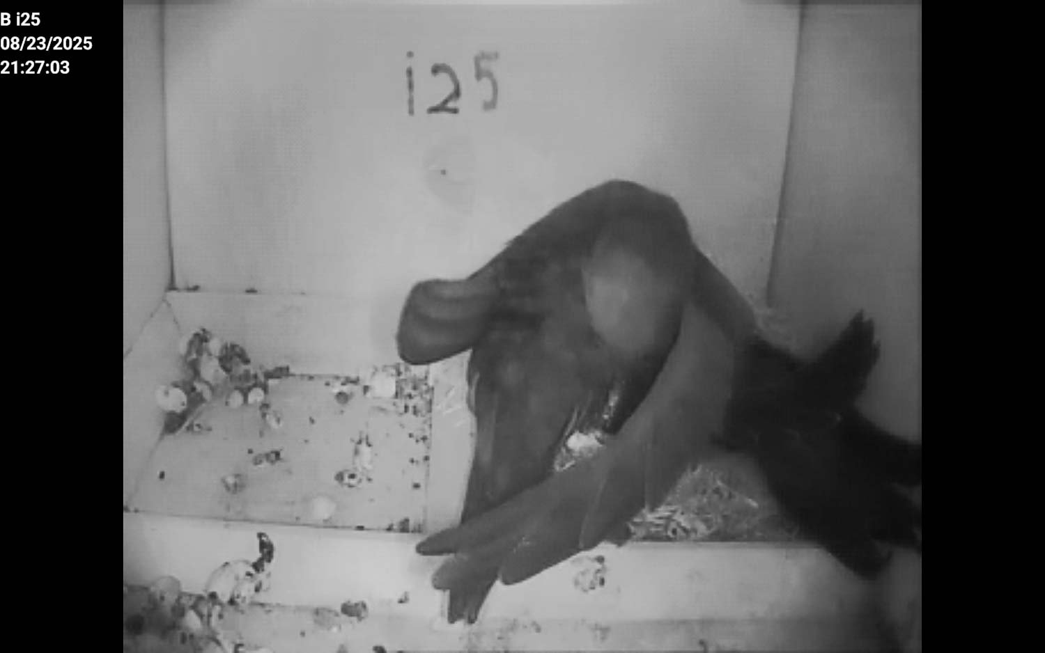 Das Küken wird tags nicht gehudert was mich vermuten lässt, dass nur noch ein AV anwesend ist. Selbigen konnte ich gestern abends mithilfe der Kamera sehen.