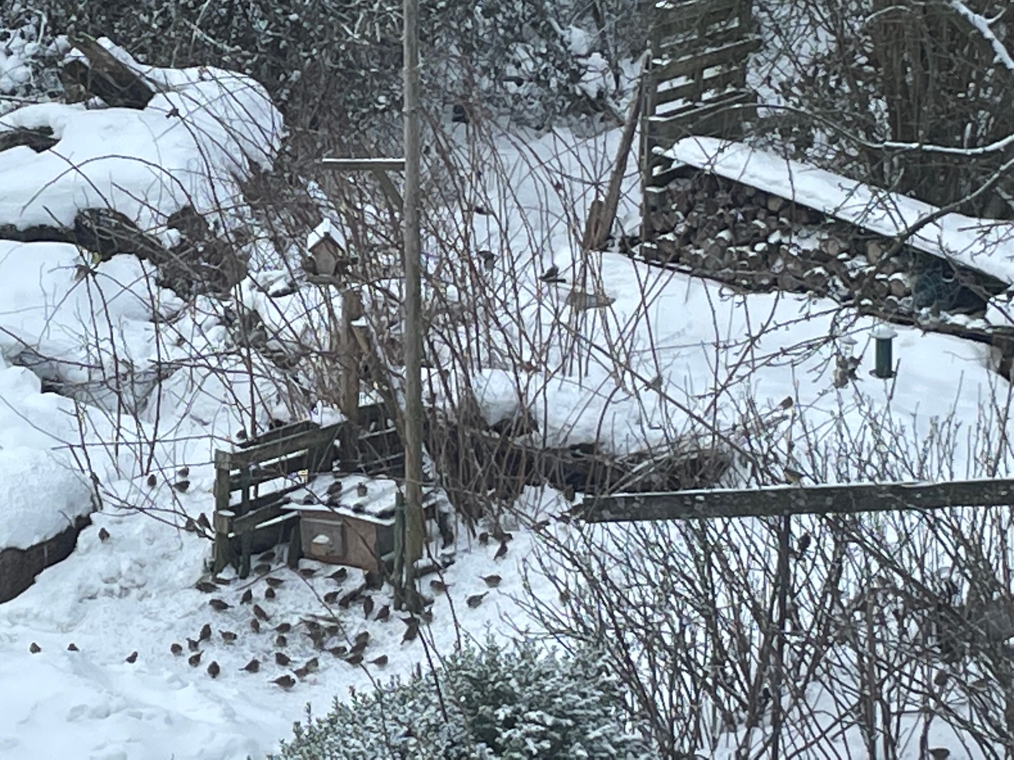 Als wir vor ein paar Tagen Dauerfrost hatten, ist die Anzahl der Futterplatzbesucher nur leicht angestiegen. 4 bis 6 Blaumeisen, etwas weniger Kohlmeisen. Rotkehlchen und Kleiber einzeln, vielleicht ein Halbes Dutzend Haussperlinge, hin und wieder auch mal ein kleiner Schwarm Schwanzmeisen. Bei den Amseln ist das Geschlechterverhältnis genau 1 zu 1, was aber bei einem einzelnen Paar auch nicht schwer zu ermitteln ist. Buchfink und Heckenbraunelle in diesem Winter bisher Fehlanzeige.