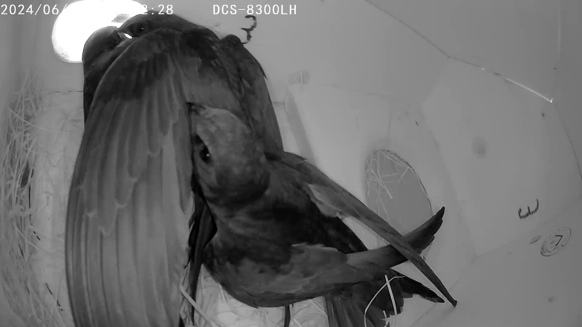 . Es ging sehr heftig zur Sache, mal wild flatternd alle 3 ineinander verkrallt, mal einer auf der Nistmulde, während die anderen zugange waren, dann längere Zeit fast bewegungslos verkrallt mit aufgerissenen Schnäbeln, dass ich schon mit dem Schlimmsten rechnete, doch dann kam wieder Bewegung in die Sache und einer wurde rausgeschmissen, dabei länger außen vor dem Ausflugloch baumelnd festgehalten, bis er endlich frei kam. Danach ging es zu zweit heftig weiter, der dritte kam wieder zurück und es ging erneut drunter und drüber, schließlich wurde wieder einer rausgeworfen und die anderen flogen auch raus, einige kleine Federn am Nistkastenboden zurücklassend. Wer da jetzt wen vertrieben hat, konnte ich nicht erkennen. Schon fürchtete ich um meine Neuansiedlung, doch - hurra