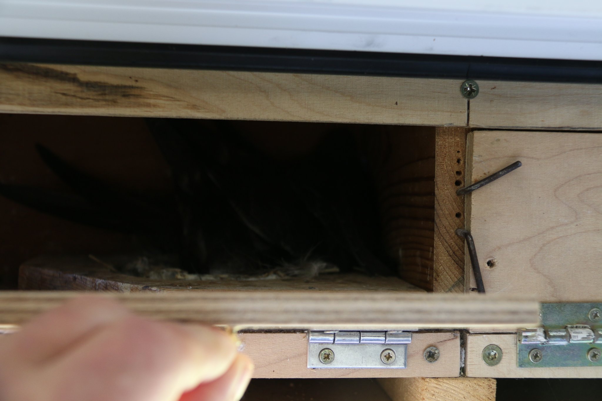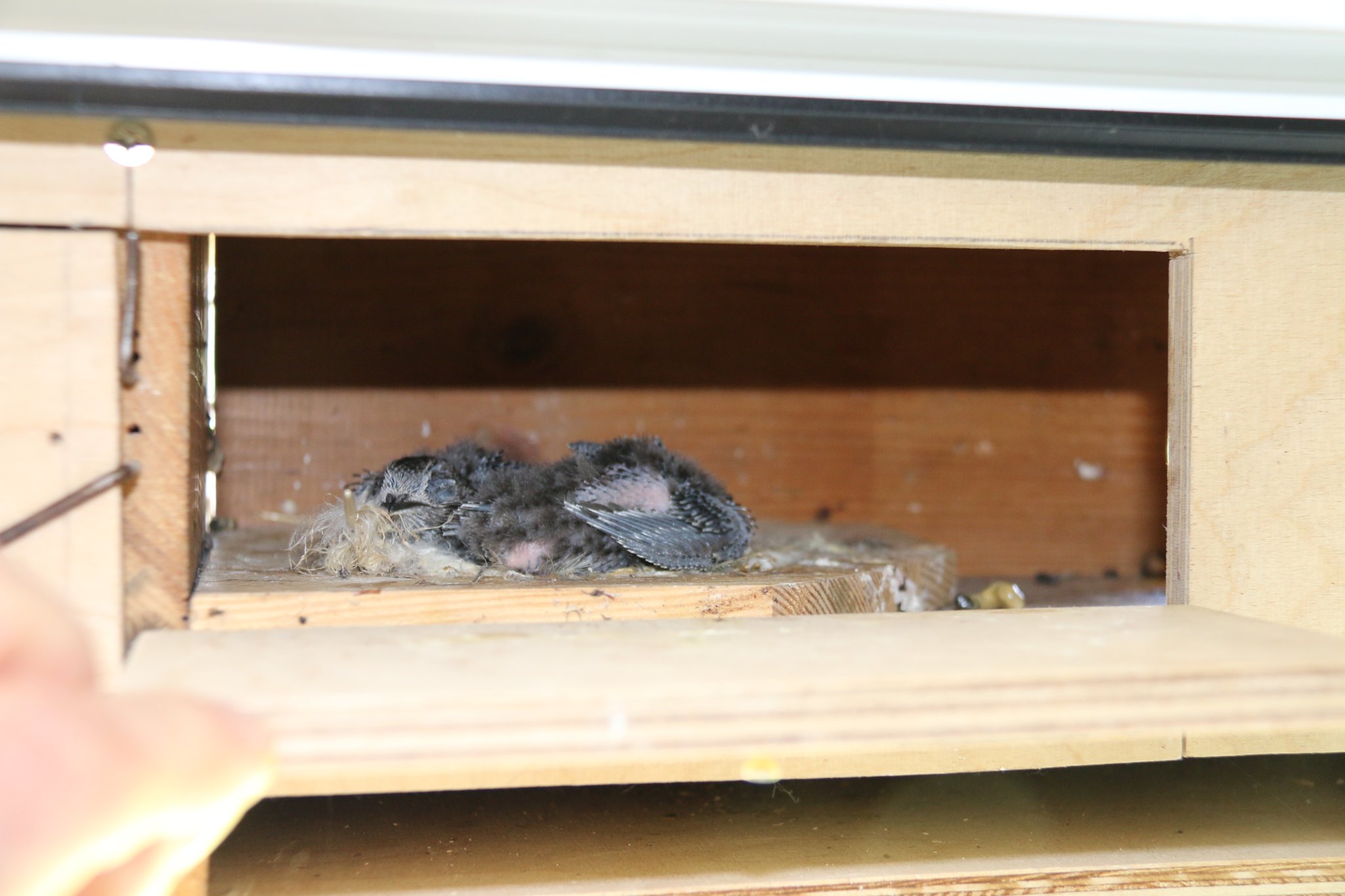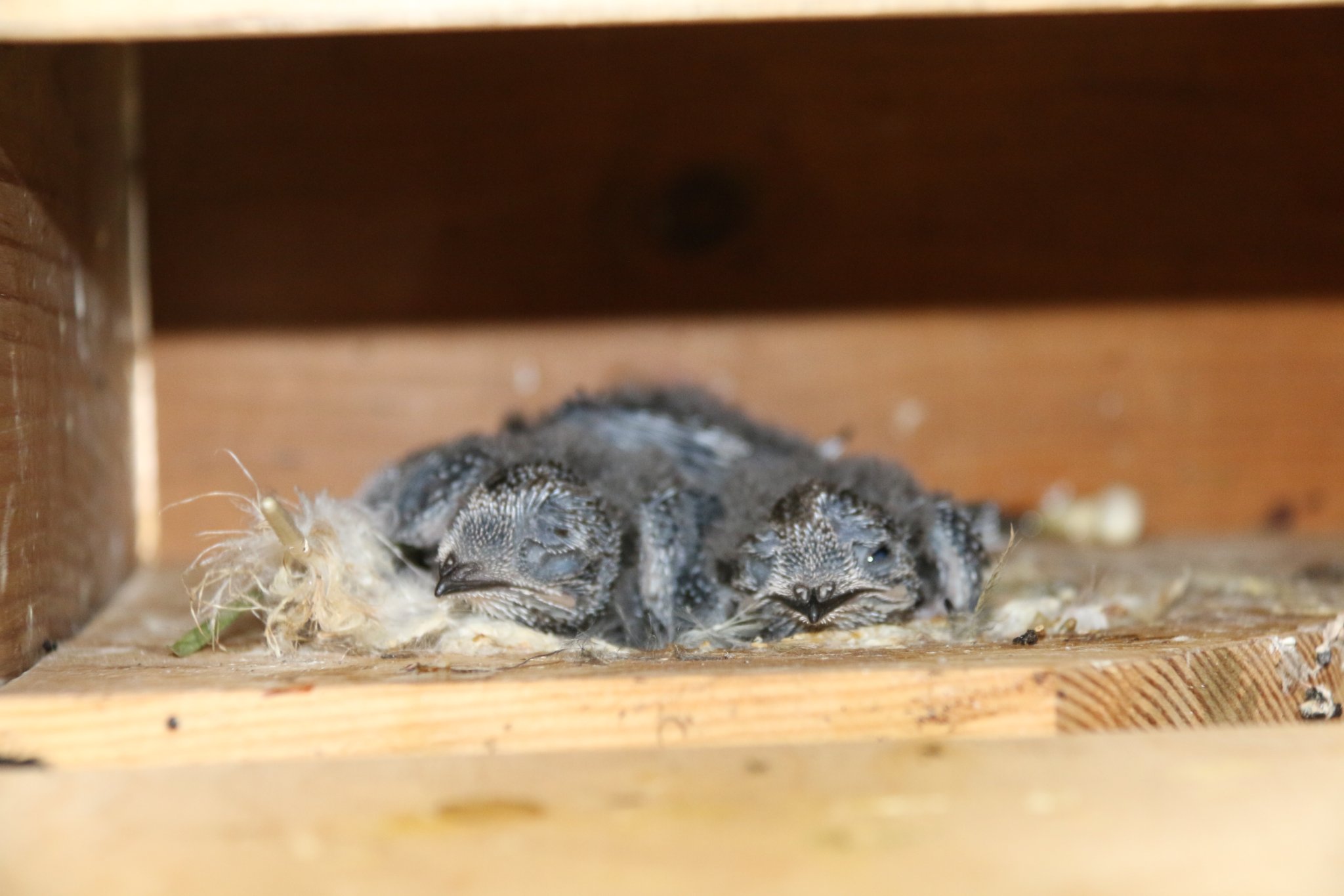Gegen 10.30 Uhr habe ich die Nistkästen an der Süd-westseite kontrolliert. Die frisch aufgetauten Heimchen waren in beiden Kästen nicht mehr vorhanden. Auf dem zweiten Bild sieht man rechts unten,keine Heimchen. Ein Altsegler saß unmittelbar hinter der Klappe, verdeckte die drei Küken und es gab kein vernünftiges Bild. Minuten vorher hatte ich bereits kontrolliert, da drängten sich die Drei nicht mehr in die Ecke sondern blickten mich erwartungsvoll an.