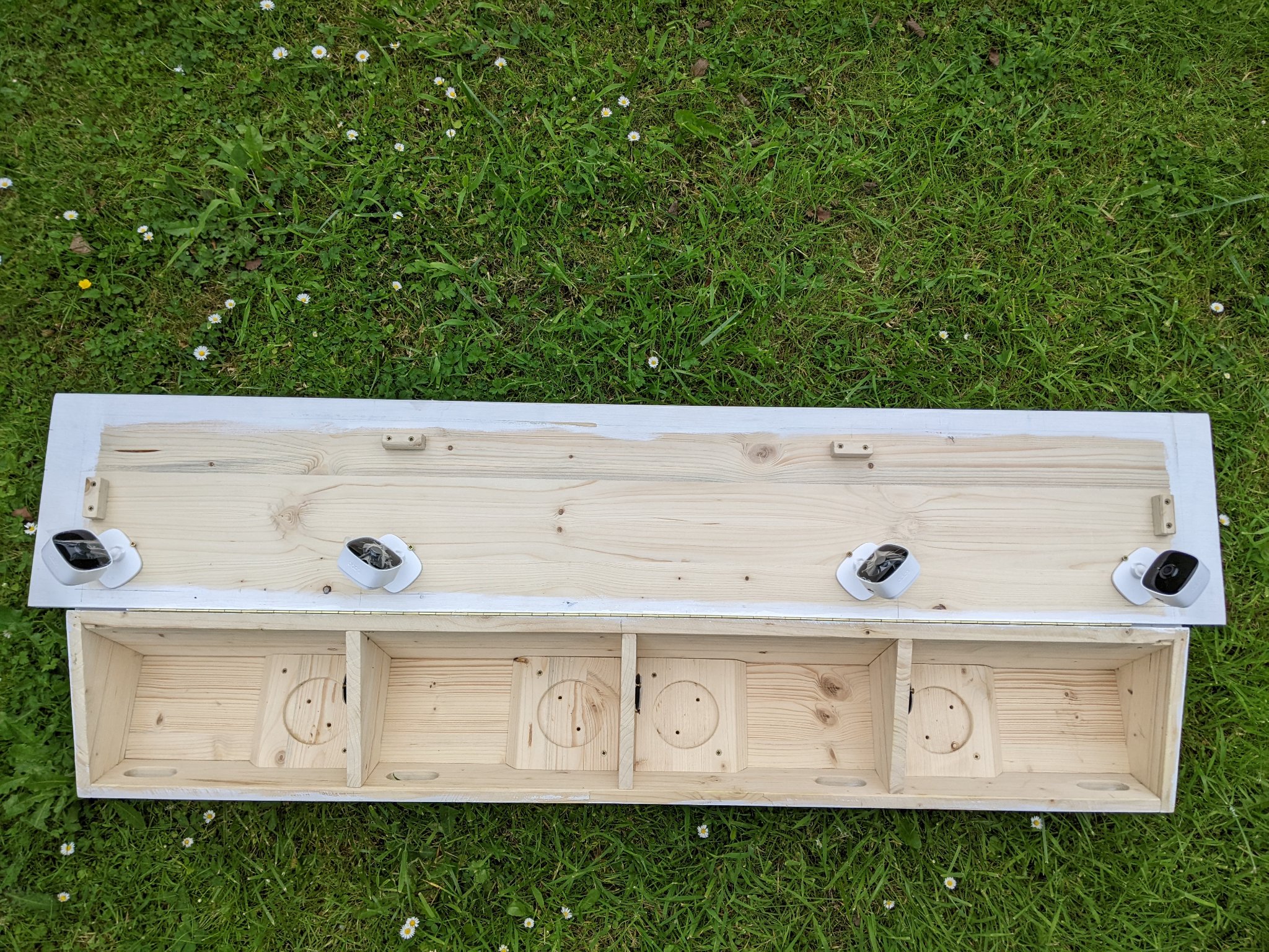 Hi, vielen Dank erstmal für eure Antworten, habe heute meine Kästen angemalert mit ein bisschen Nistmaterial ausgestattet und meinen Kasten Marke Eigenbau aufgehängt. An dem kann ich ganz entspannt vom Badezimmerfenster aus eine Bluetooth Box installieren.