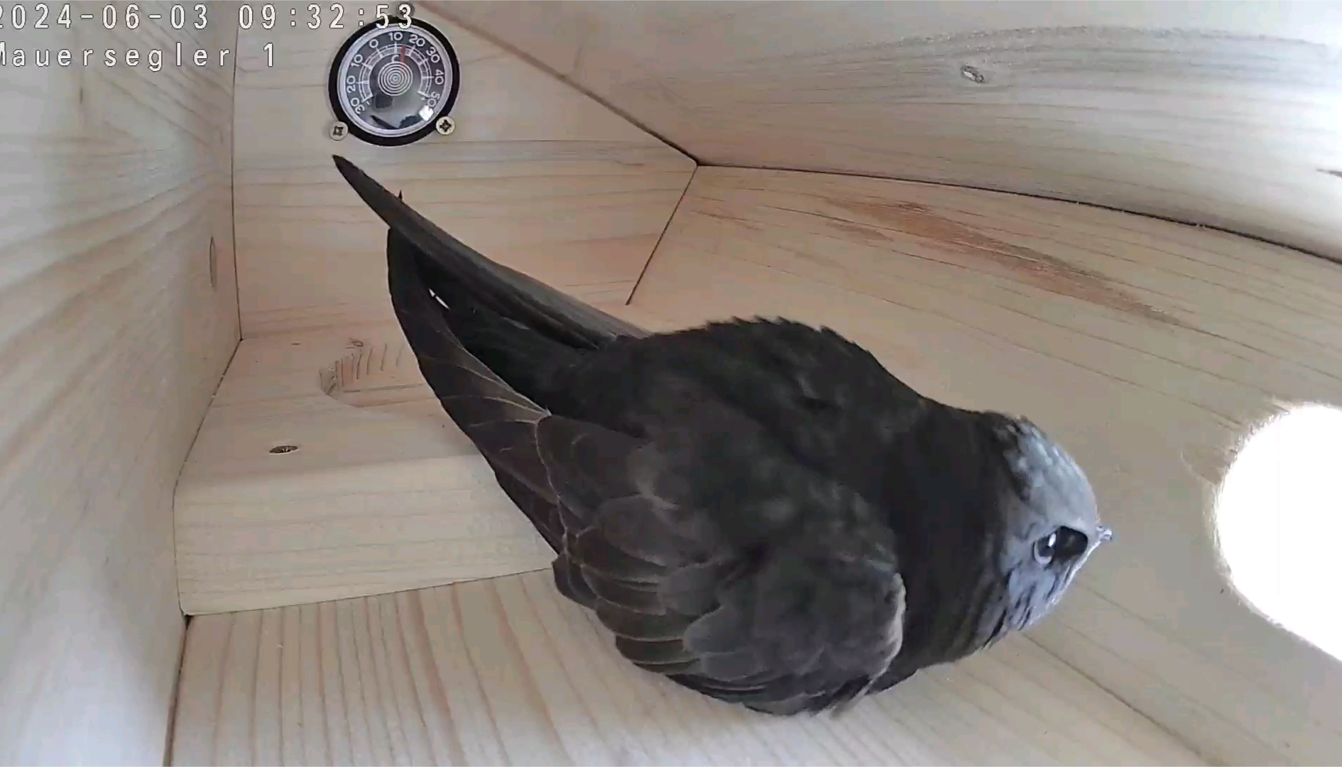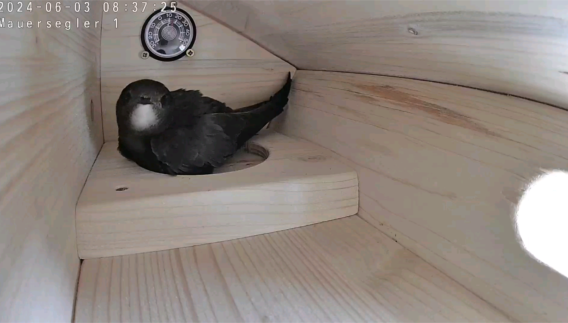 Heute Morgen erfolgte um 7:26 Uhr, noch vor dem Locken, das erste "Anklatschen" am Flugloch. Drei Minuten später dann der Einflug eines Mauerseglers.