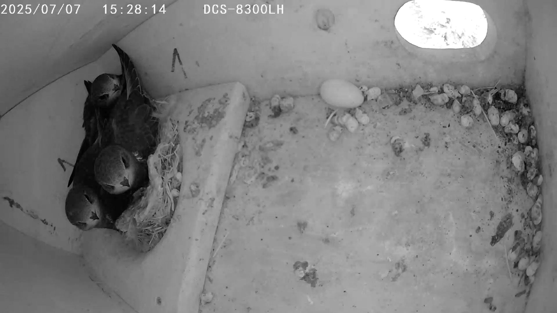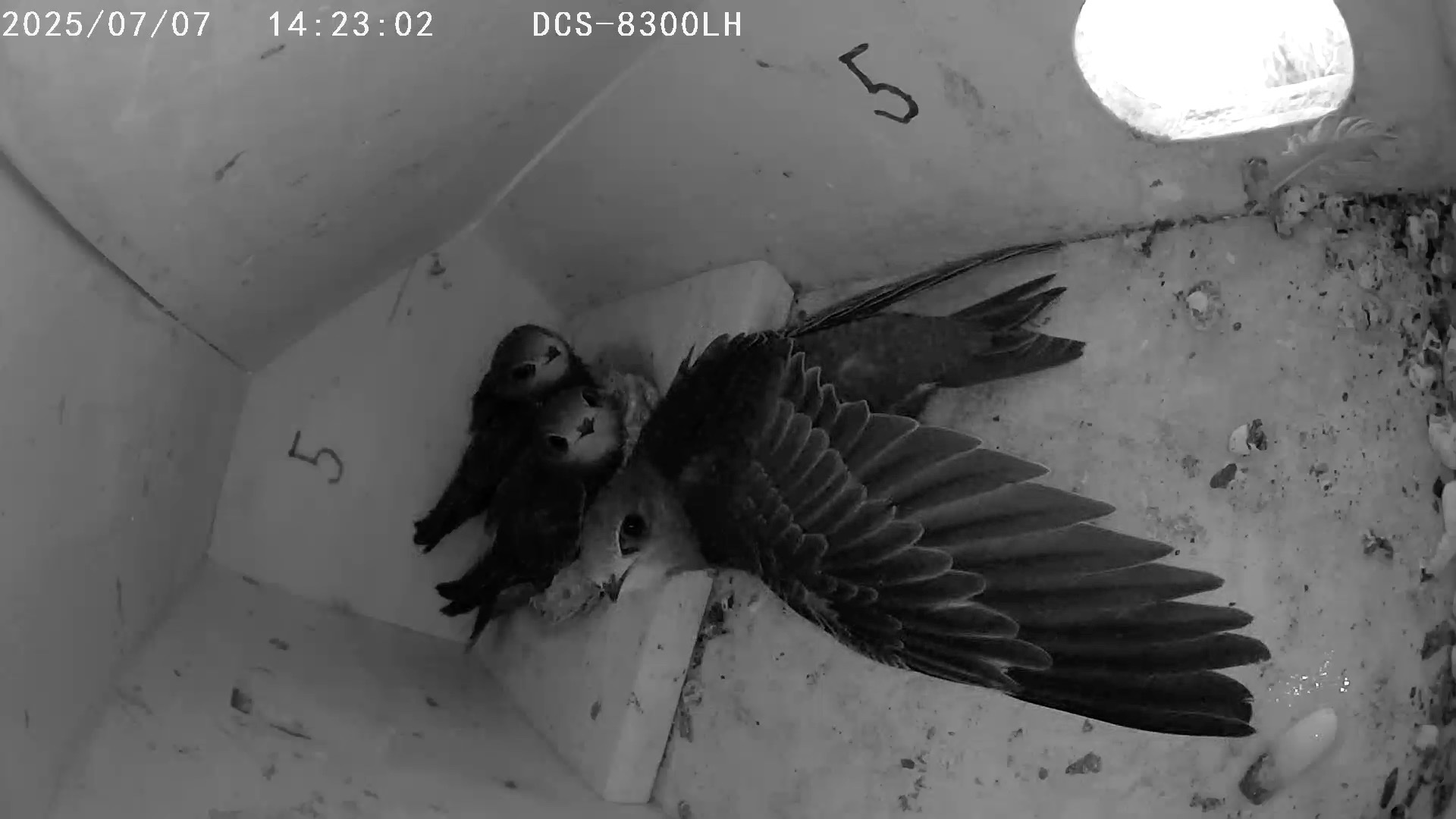Der Exodus meiner JV läuft weiter, untypischerweise auch heute Vormittag. Gegen 10:12 Uhr startete der erste aus Balkonkasten 3. Fast zeitgleich der erste aus der Viererbrut und wohl kurz darauf ein zweiter (Die Kamera zeichnet wegen des größeren Abstandes nur lückenhaft auf). Es sieht sich so aus, als wenn es Starts in Giebelkasten 1 und 5 gegeben haben könnte. Drücken wir den Startern die Daumen, dass sie dem Regenwetter zeitig ausweichen können.