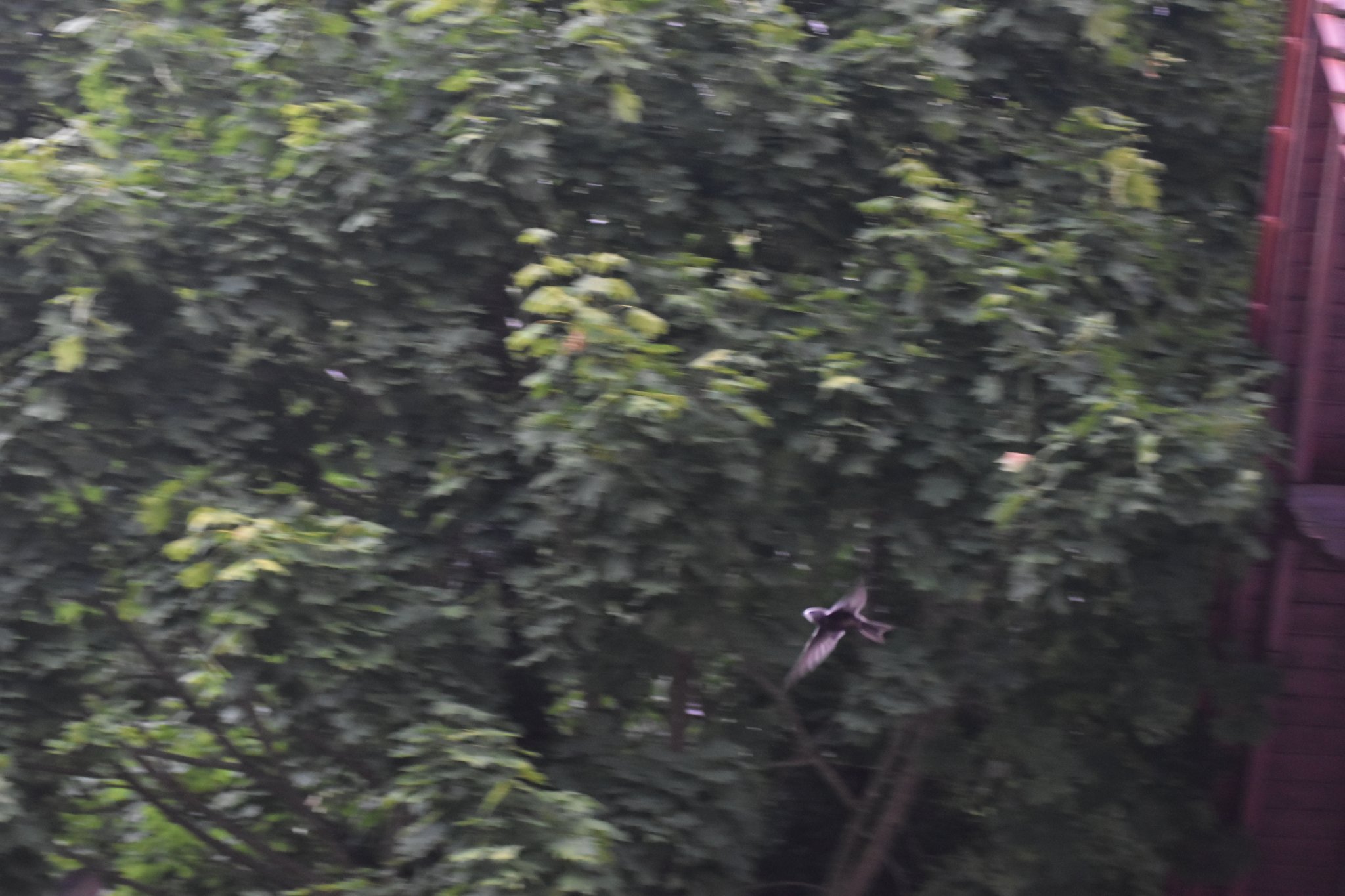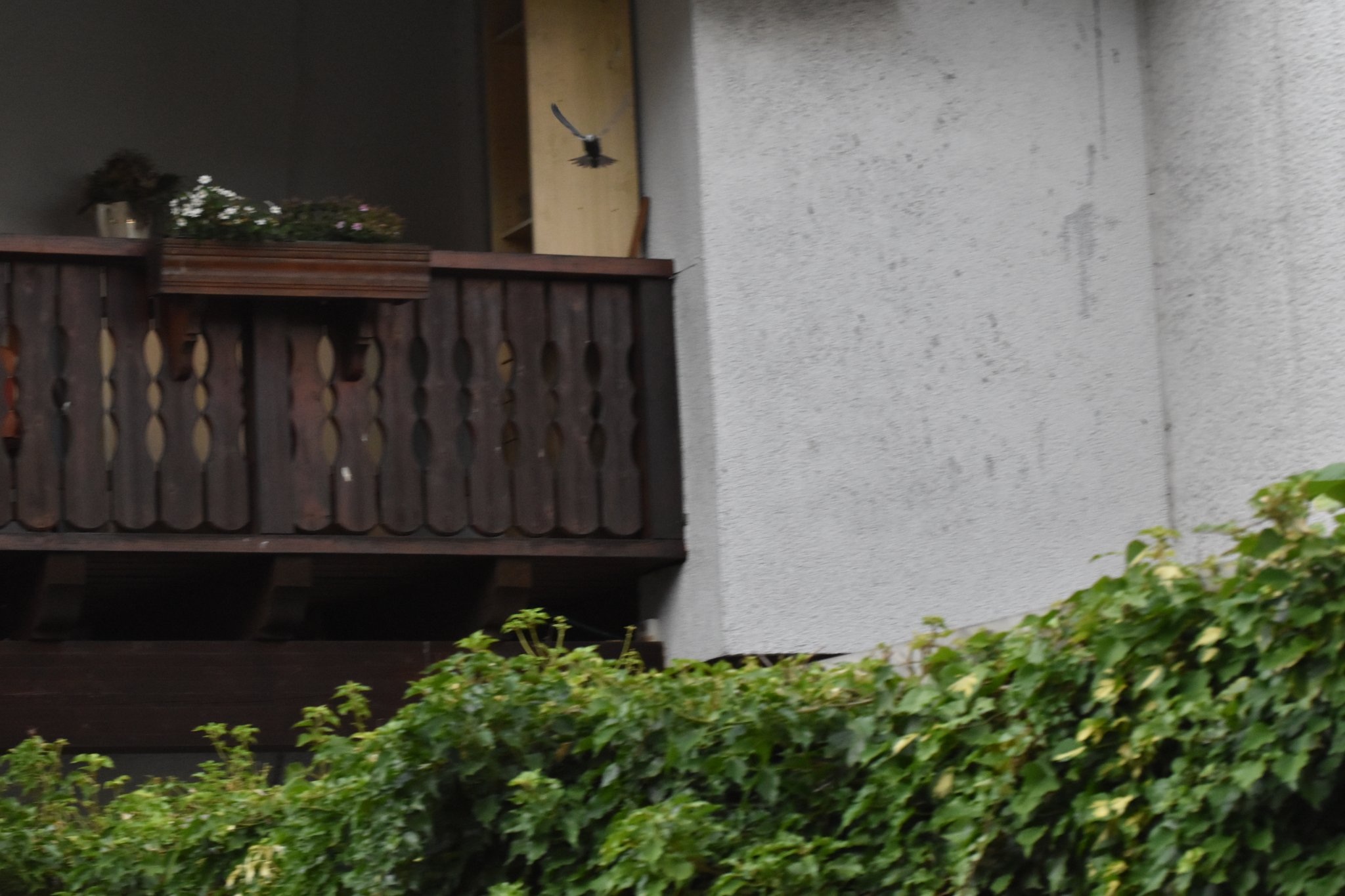 Er verlässt den Bereich der Balkonkastenreihe, immer noch mit hoher Flügelschlag-Frequenz